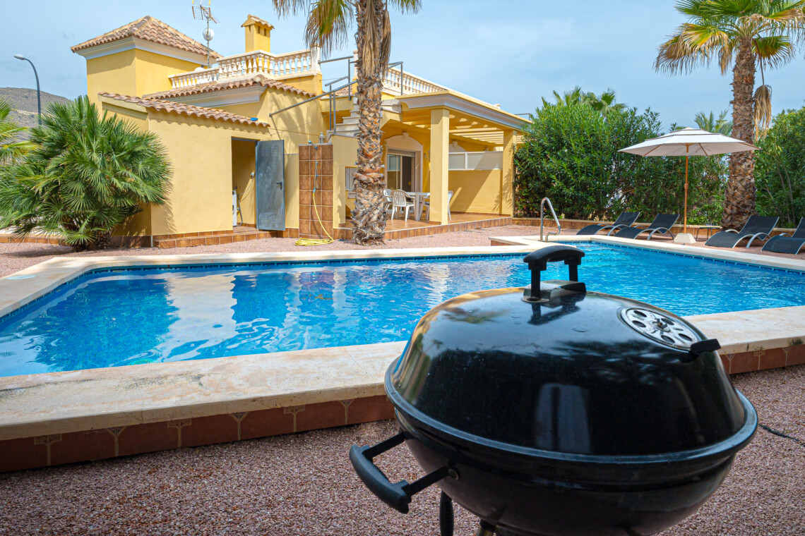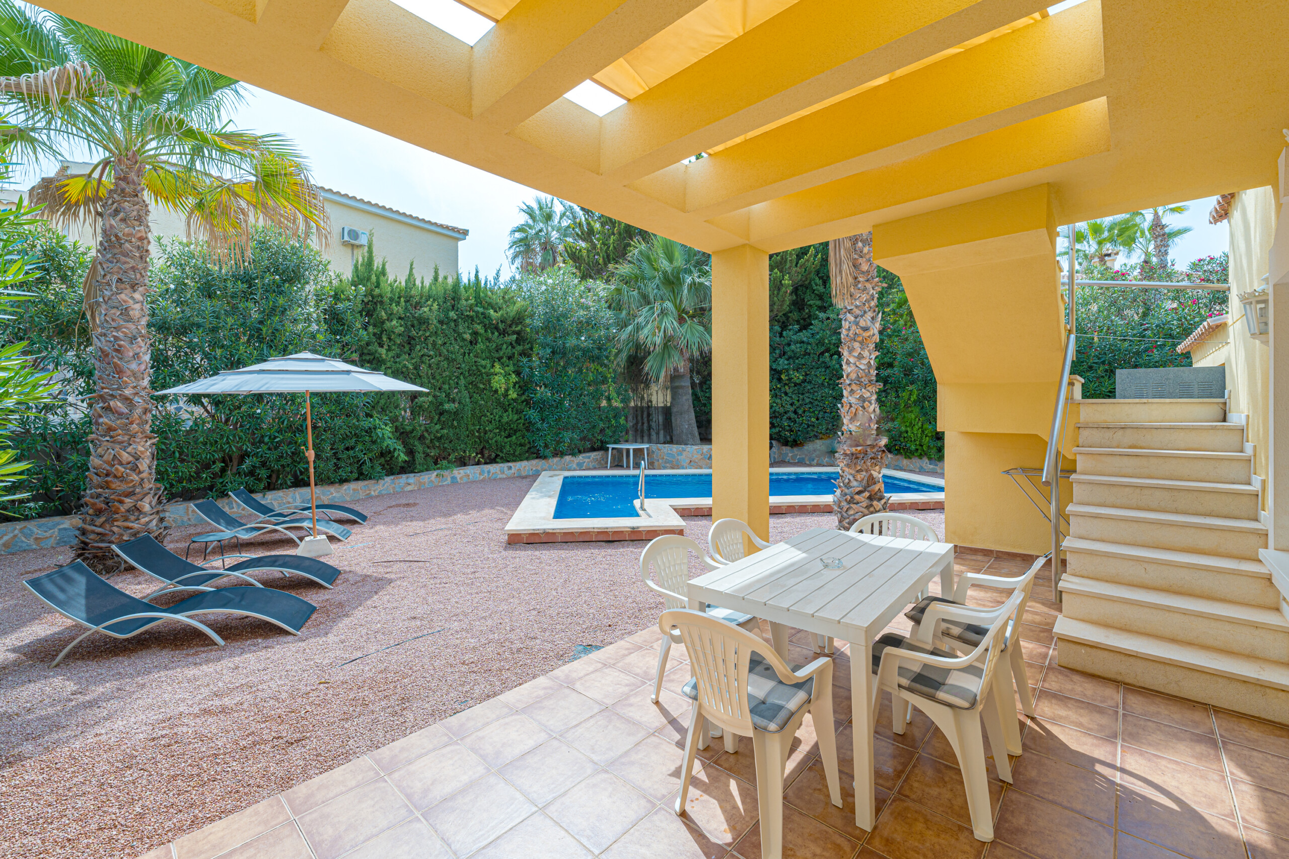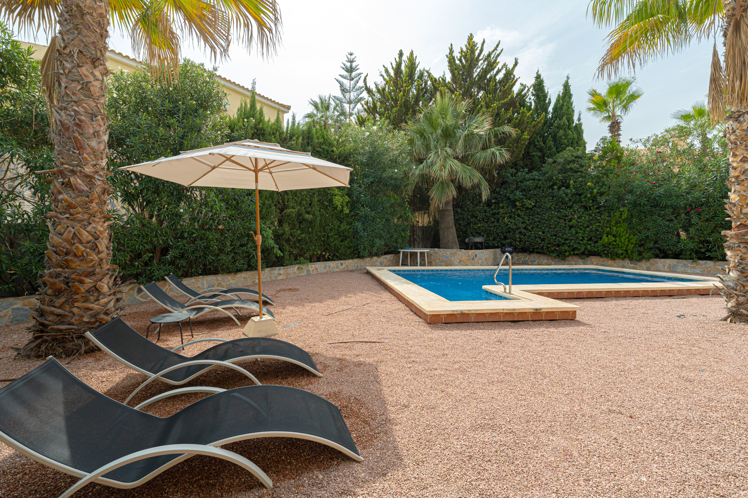En el exterior, podrás disfrutar de una piscina privada, cinco tumbonas para relajarte, una mesa para comer al aire libre, una barbacoa y un exuberante jardín tropical.