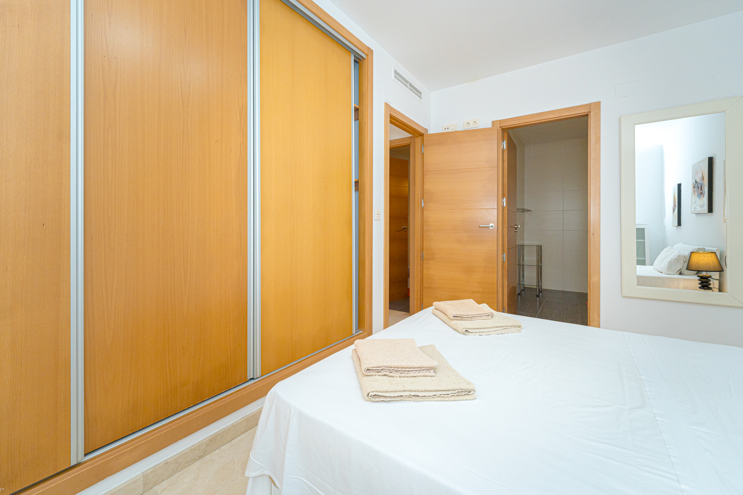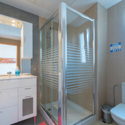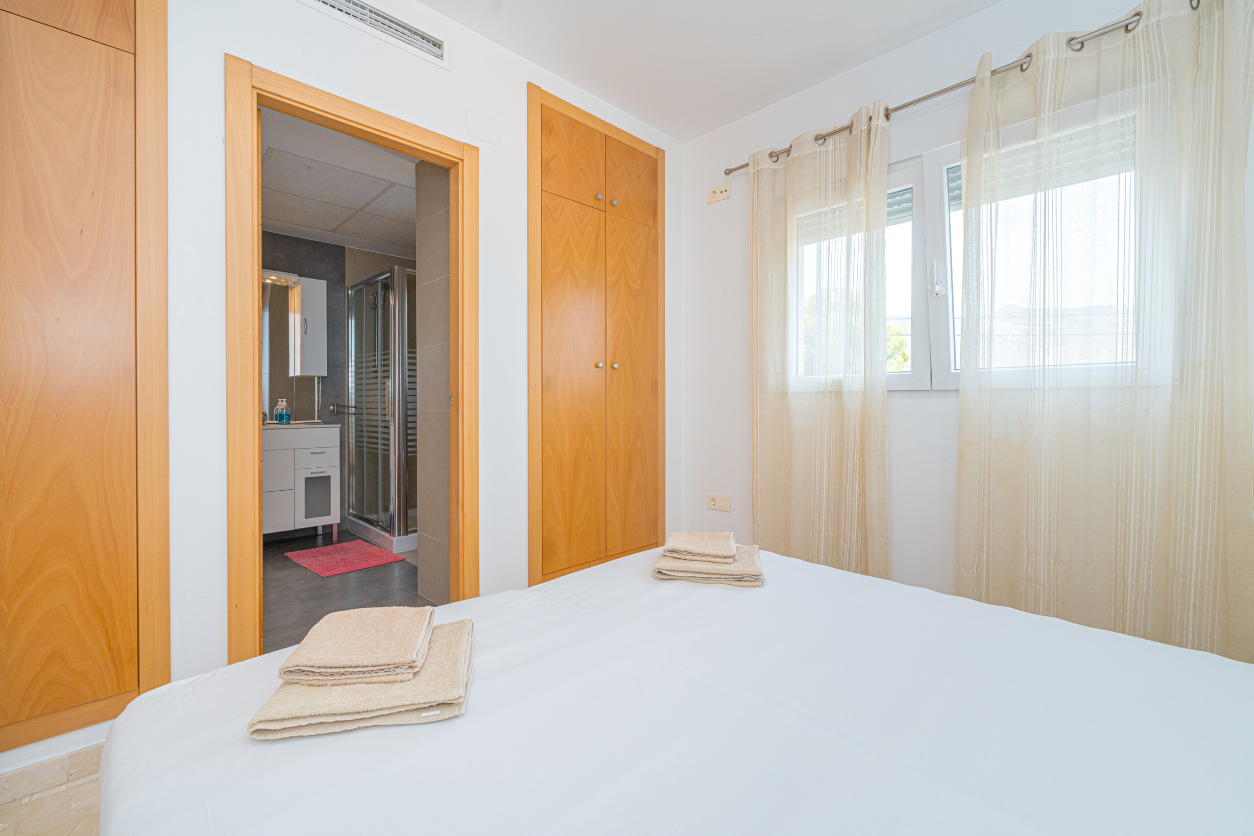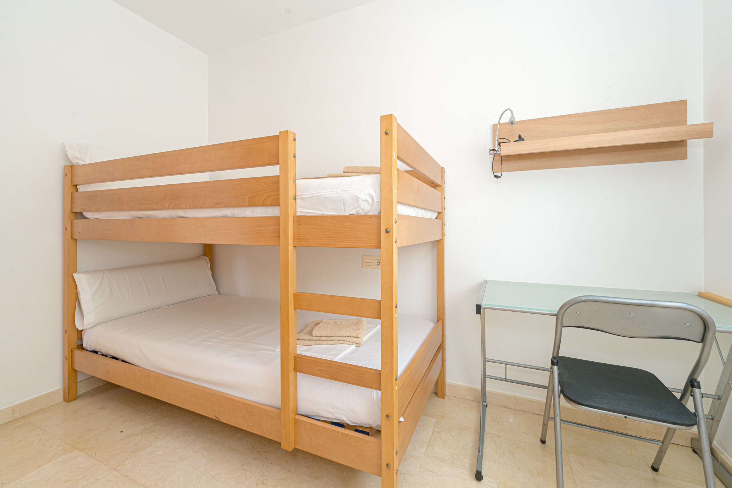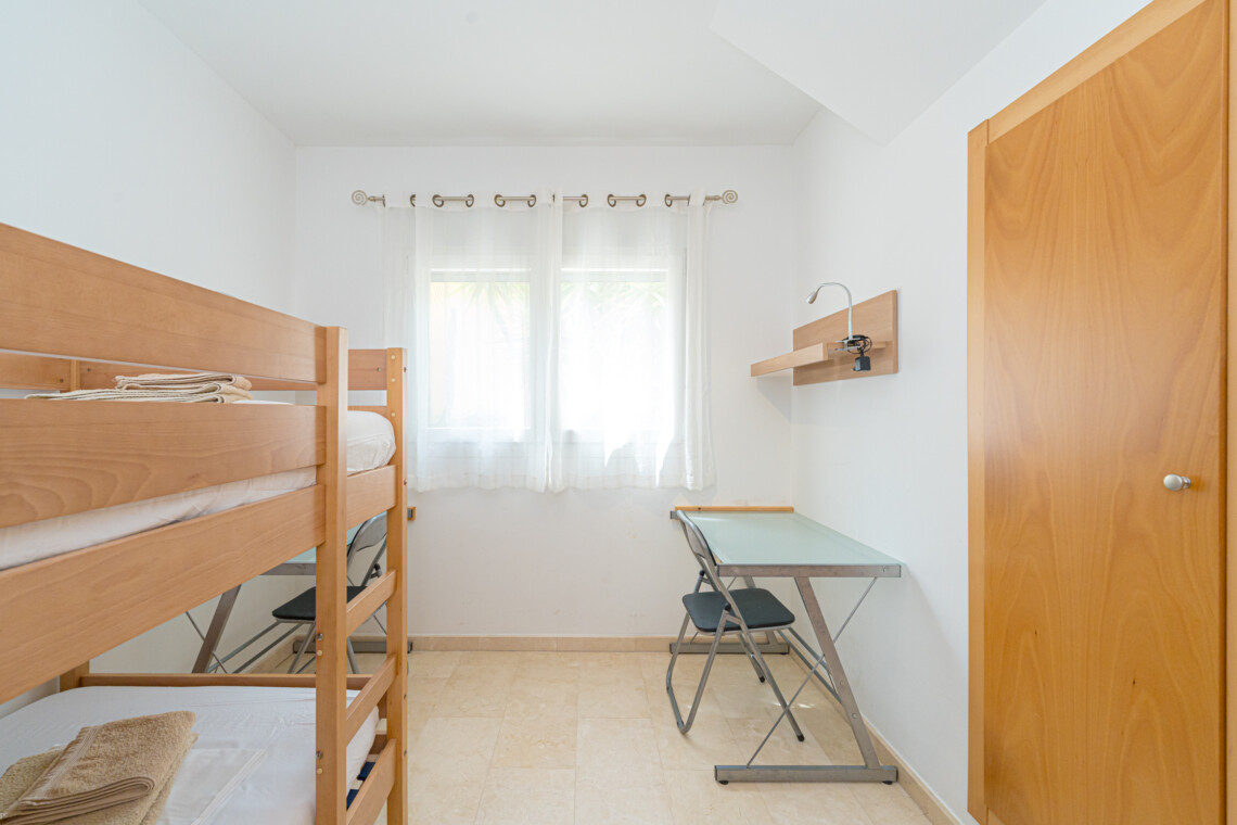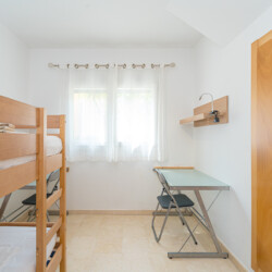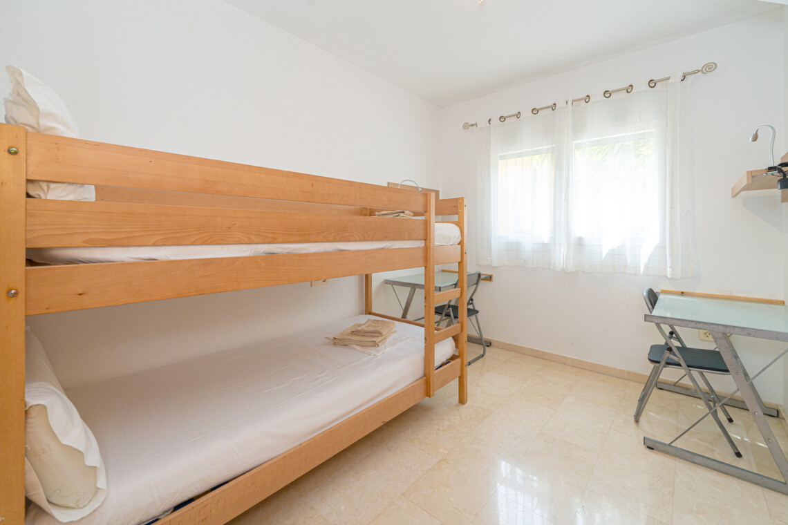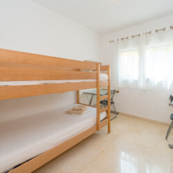 La vivienda cuenta con 3 dormitorios principales, cada uno con camas matrimoniales, y un dormitorio infantil con una litera. Además, dos de los dormitorios principales incluyen baño privado para mayor comodidad.
