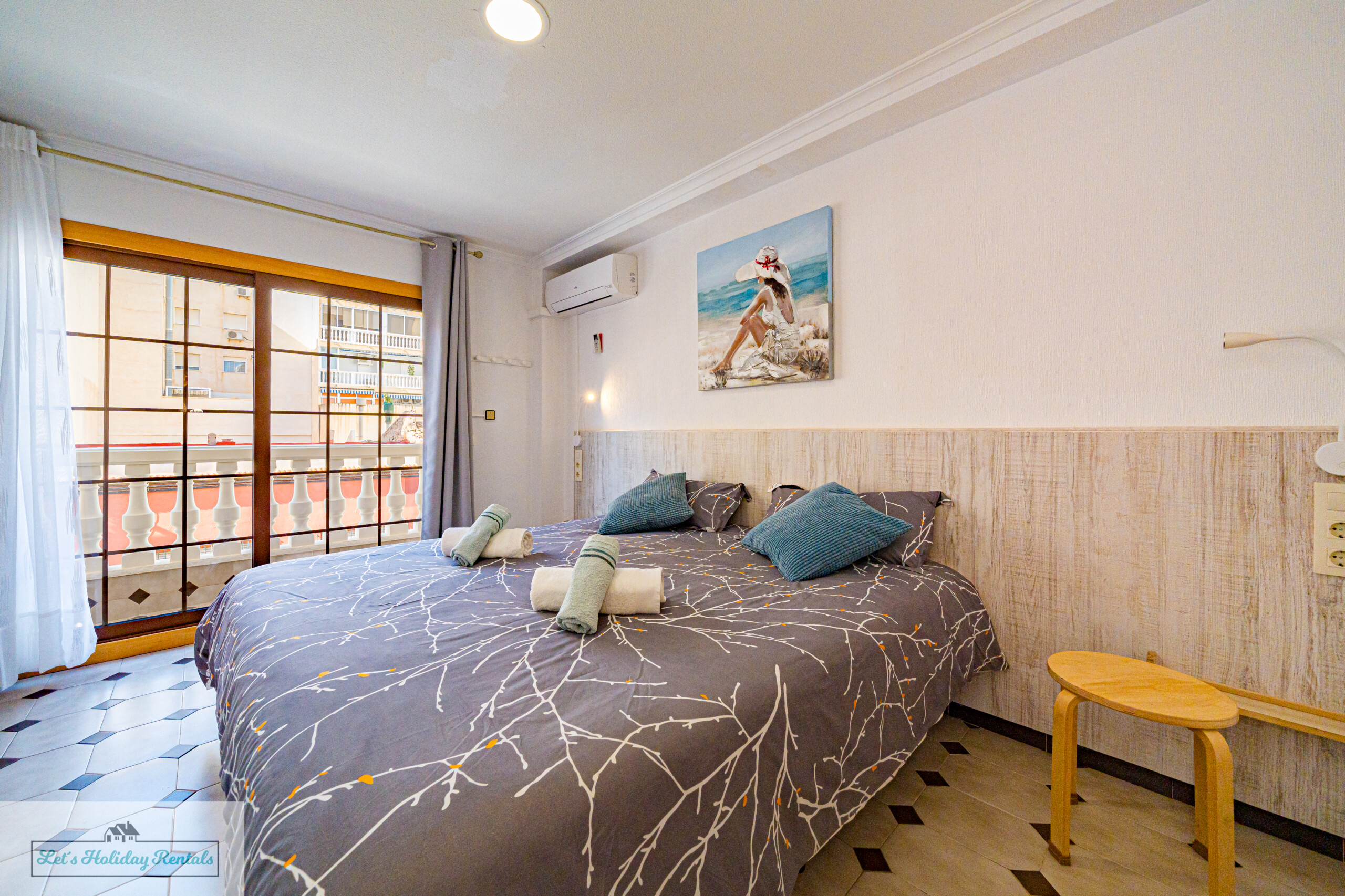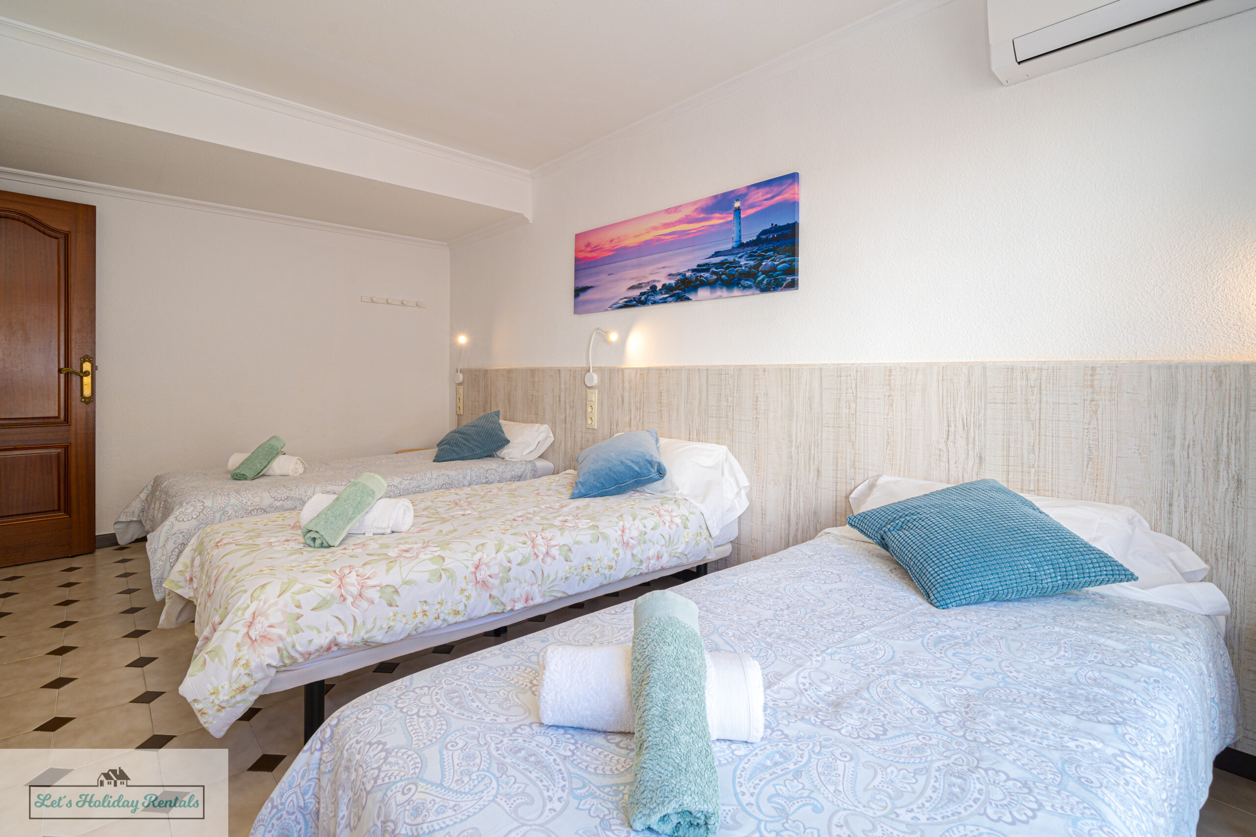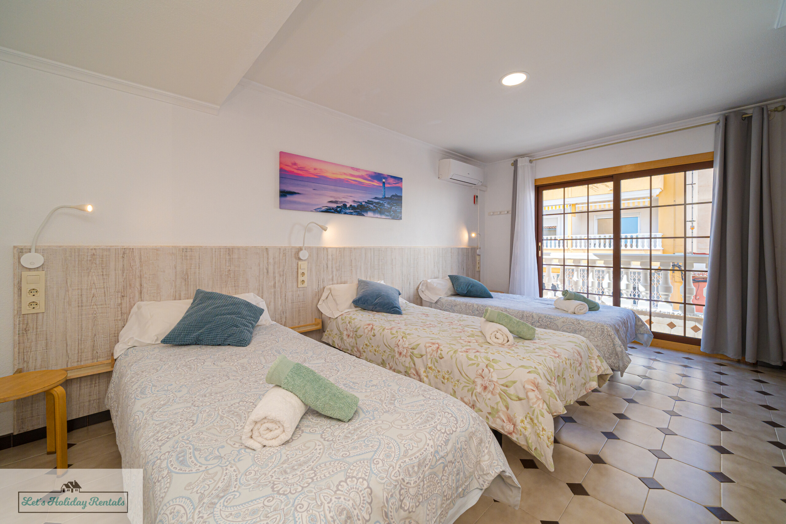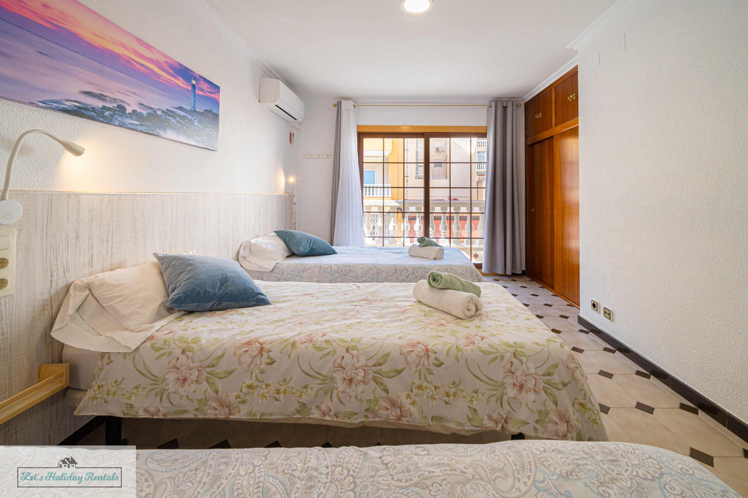 El tercer dormitorio ofrece tres camas individuales, armarios empotrados, persianas y aire acondicionado. Desde aquí, puedes salir al balcón amueblado y disfrutar de las impresionantes vistas al mar y a las arenas doradas de El Campello. Encontrarás las camas listas, con ropa de cama limpia y fresca, junto con un juego de toallas (facial, de ducha y de playa) para cada huésped.