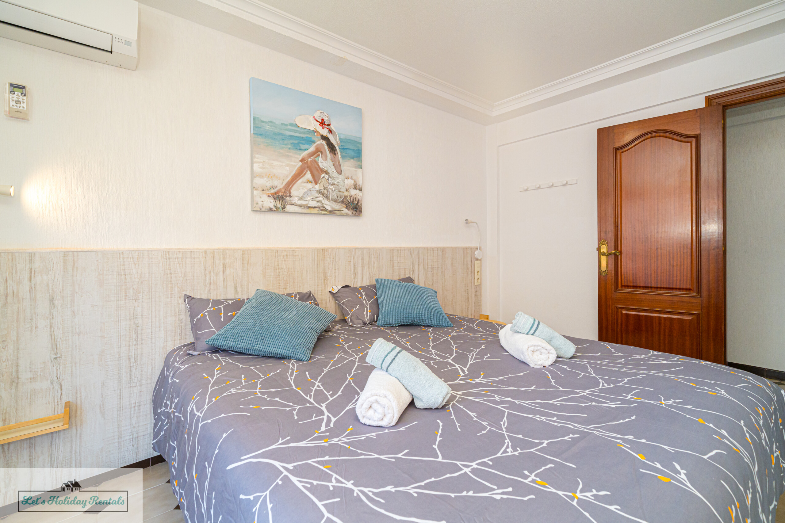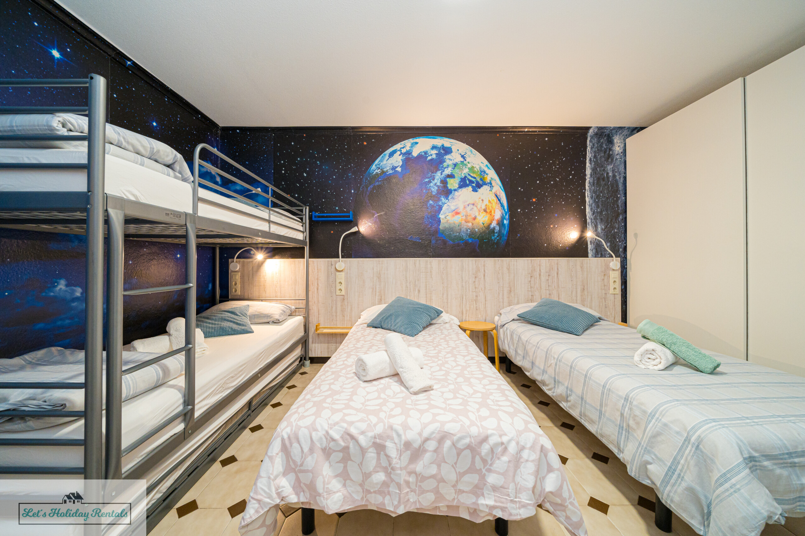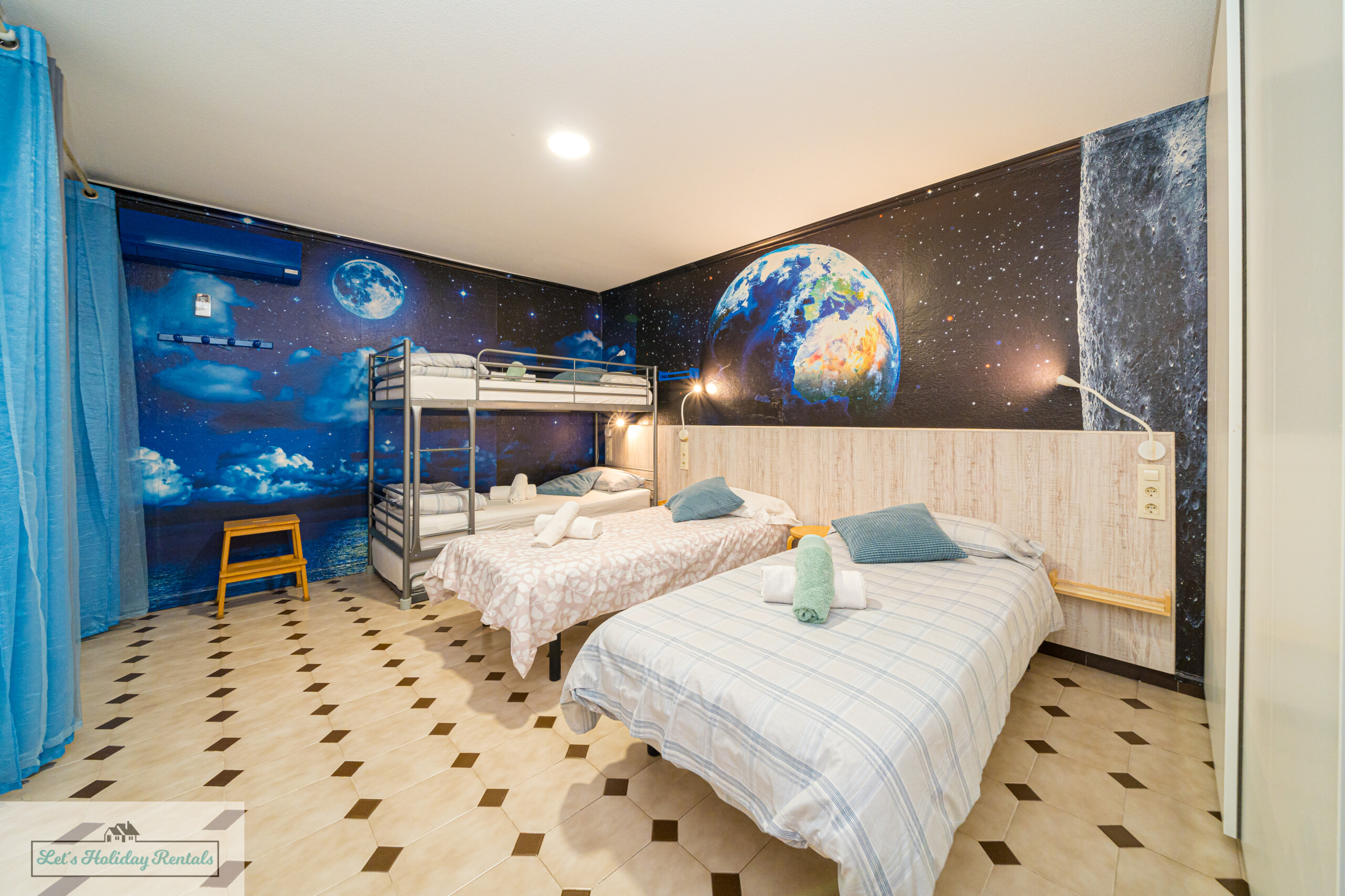 El tercer dormitorio ofrece tres camas individuales, armarios empotrados, persianas y aire acondicionado. Desde aquí, puedes salir al balcón amueblado y disfrutar de las impresionantes vistas al mar y a las arenas doradas de El Campello. Encontrarás las camas listas, con ropa de cama limpia y fresca, junto con un juego de toallas (facial, de ducha y de playa) para cada huésped.
