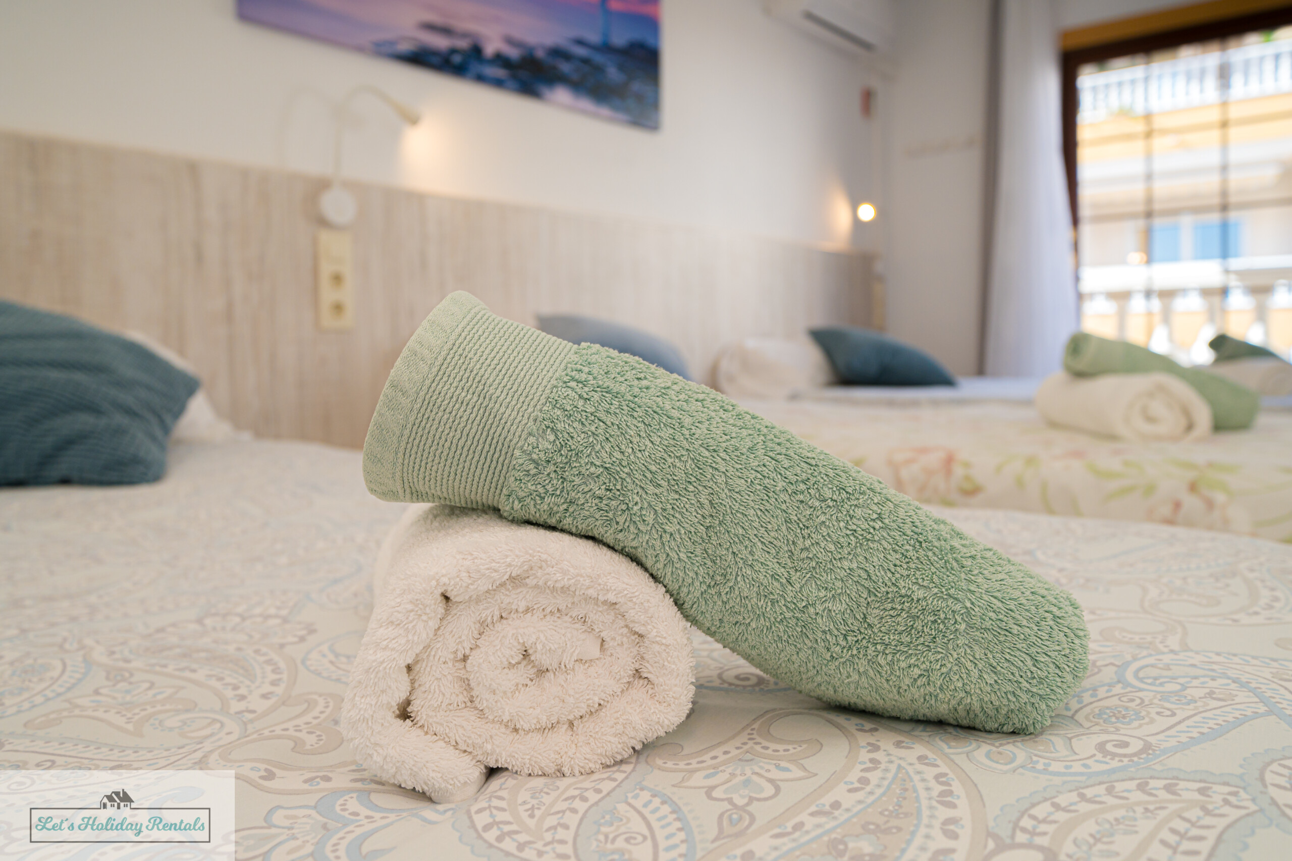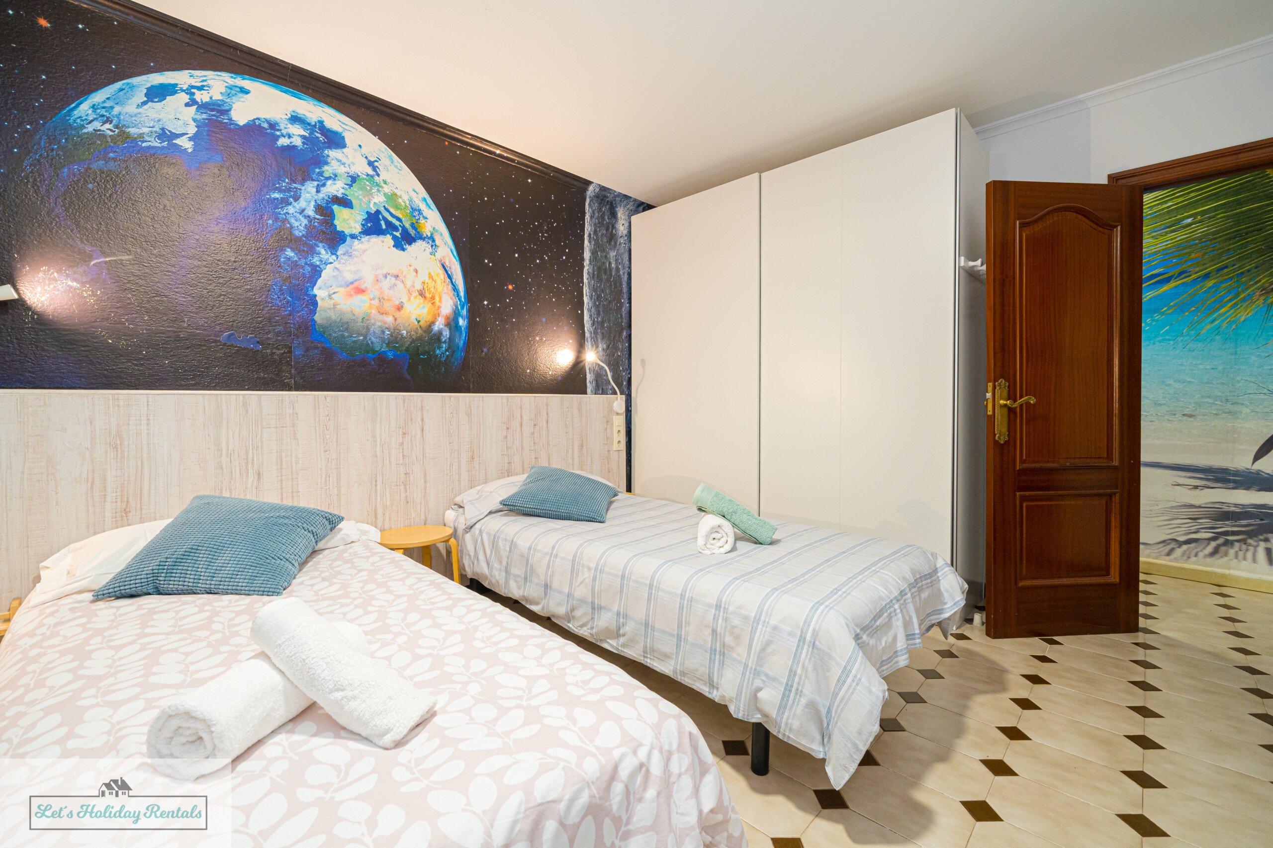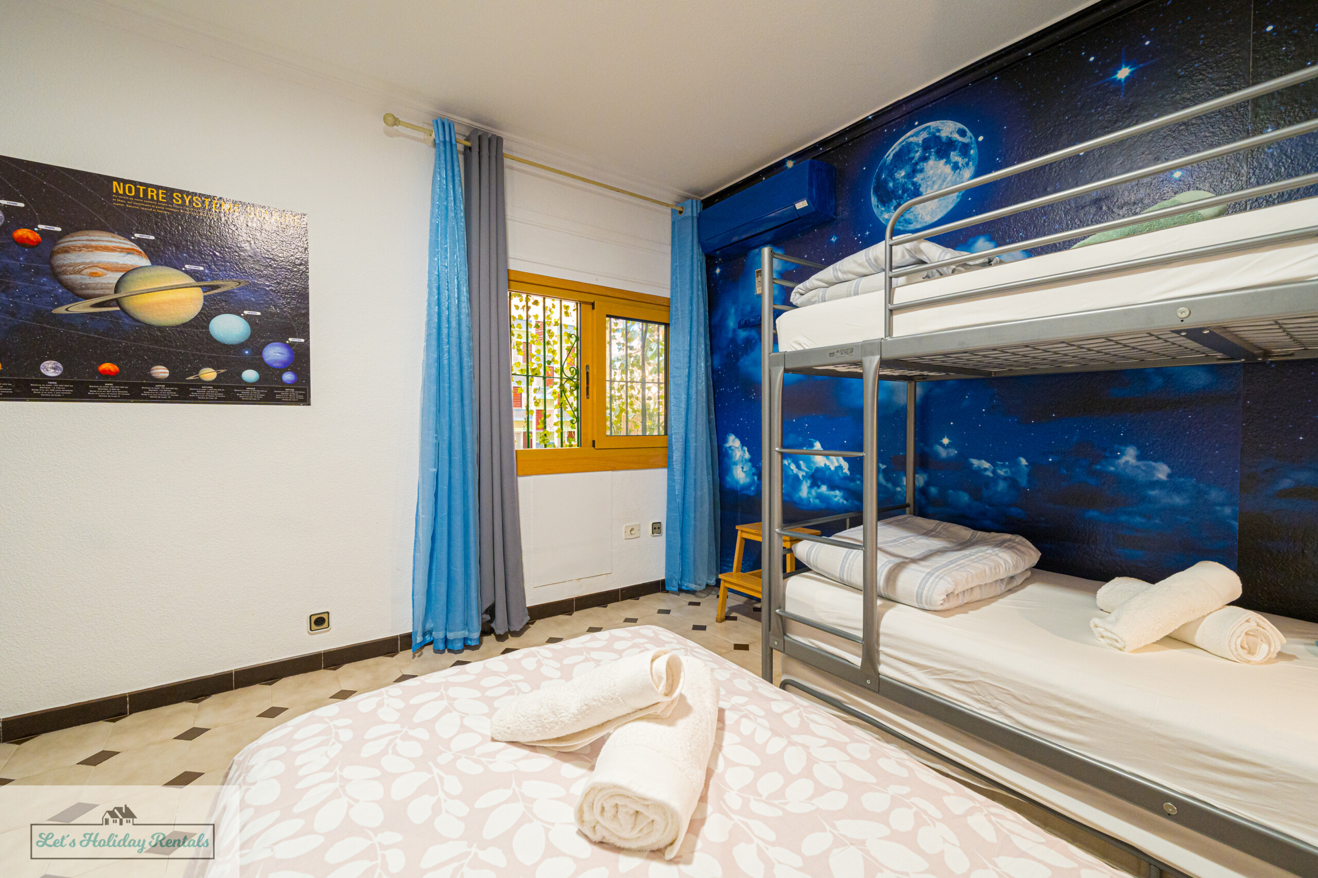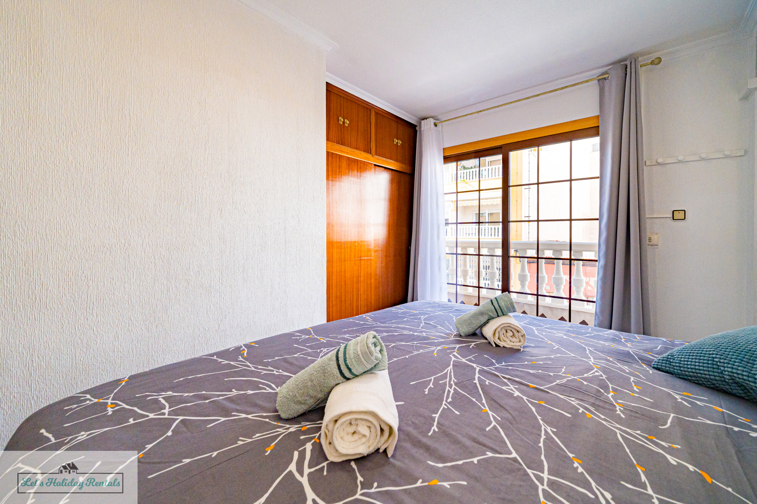 El tercer dormitorio ofrece tres camas individuales, armarios empotrados, persianas y aire acondicionado. Desde aquí, puedes salir al balcón amueblado y disfrutar de las impresionantes vistas al mar y a las arenas doradas de El Campello. Encontrarás las camas listas, con ropa de cama limpia y fresca, junto con un juego de toallas (facial, de ducha y de playa) para cada huésped.