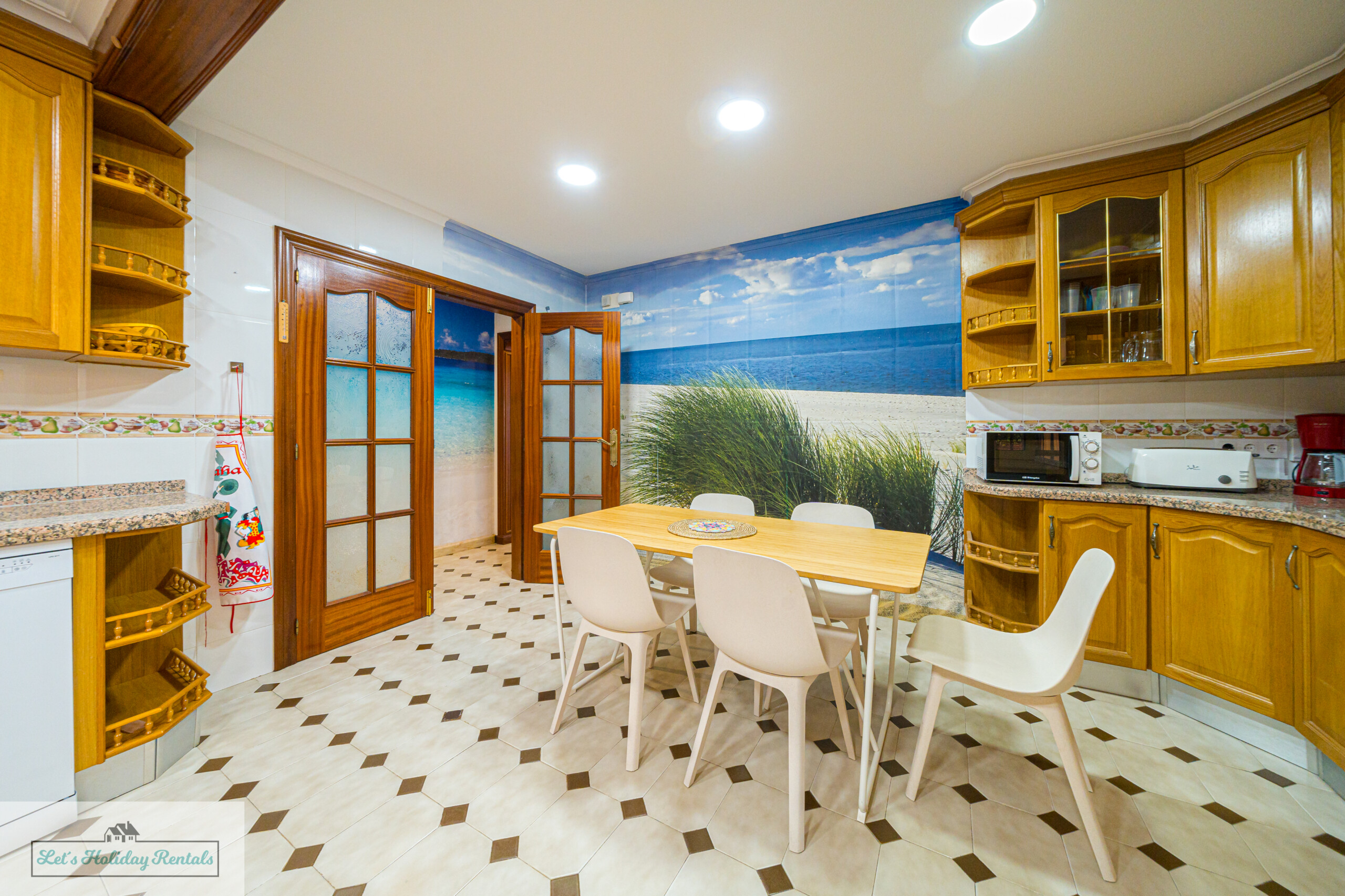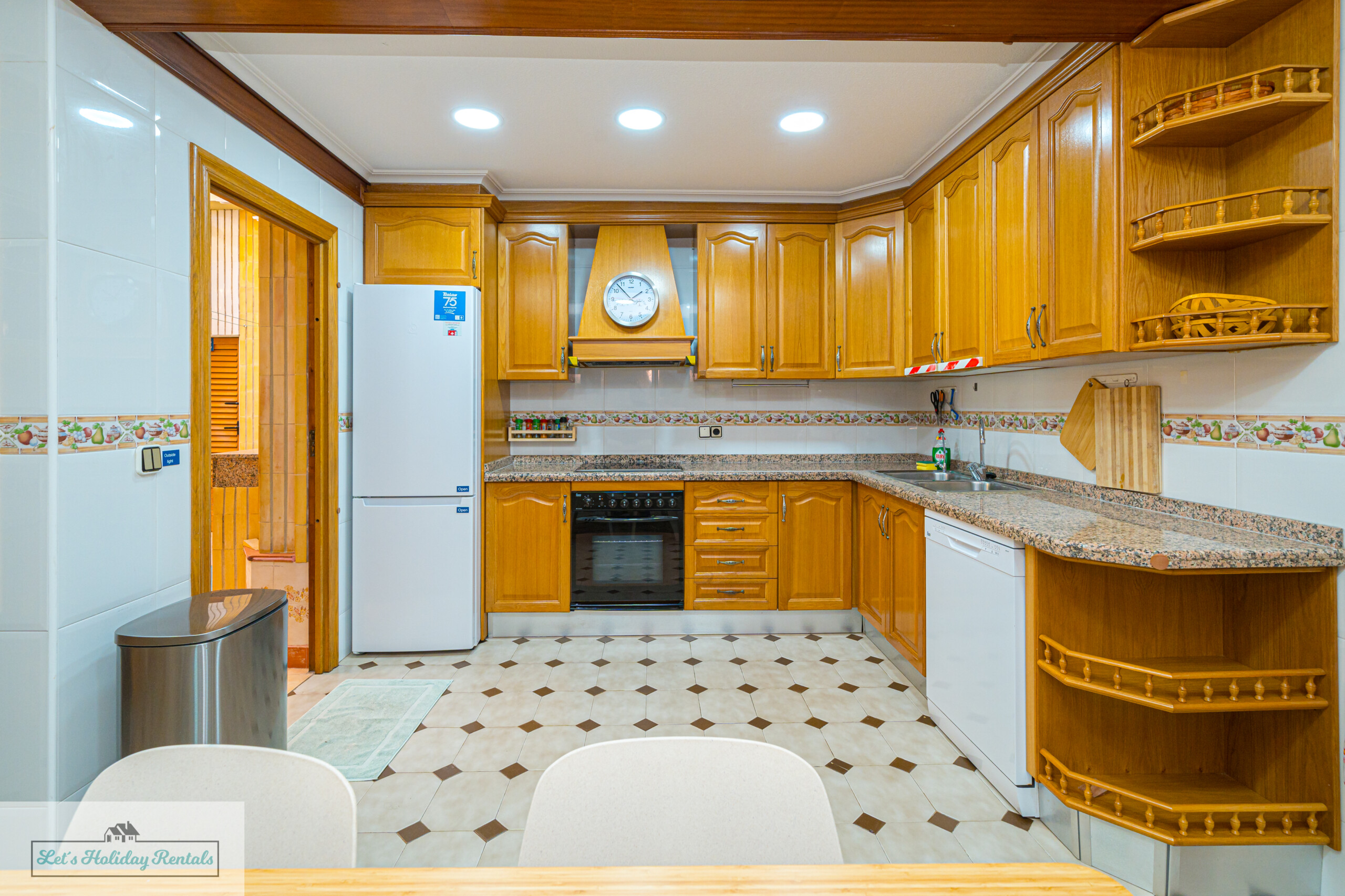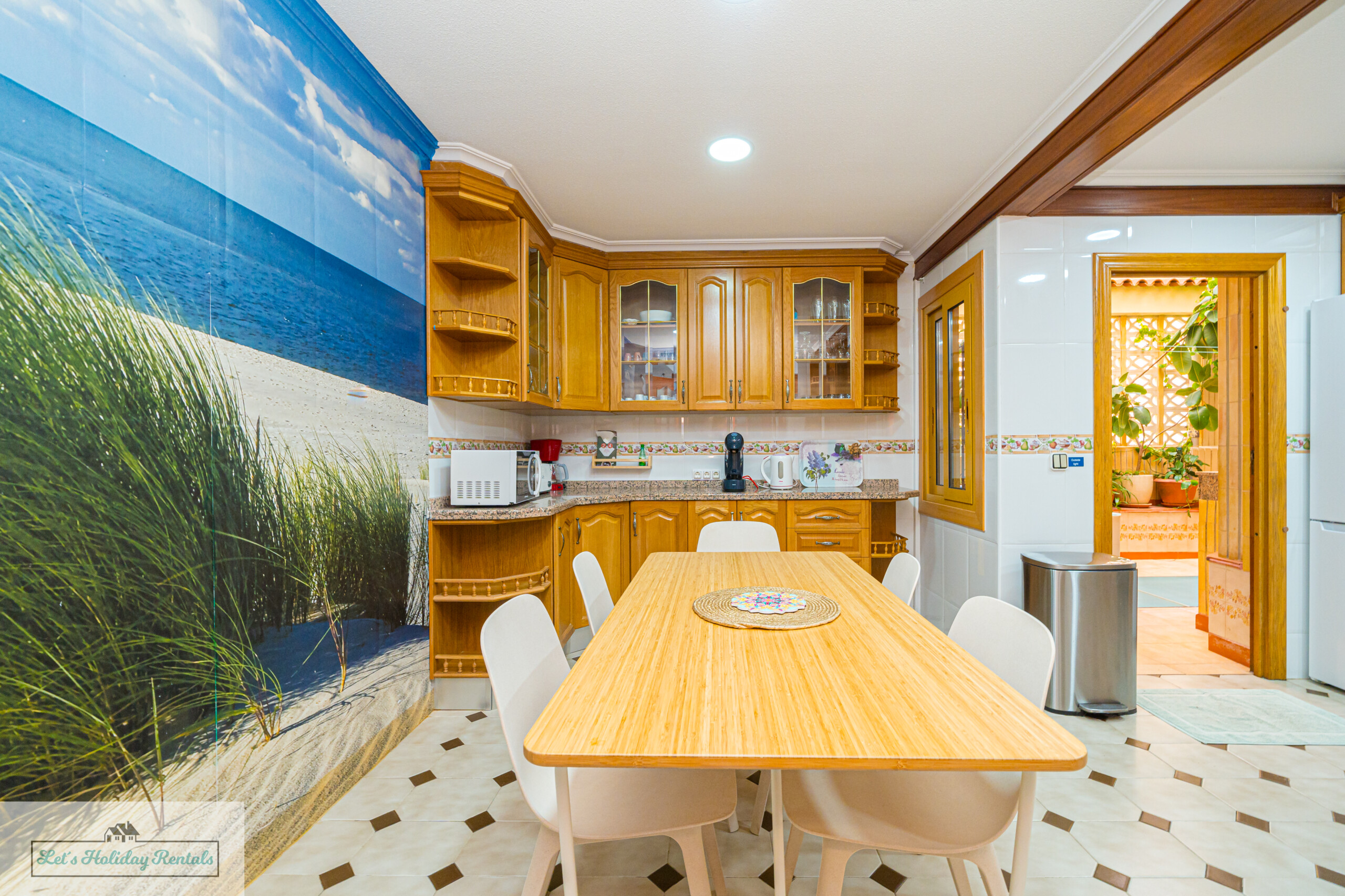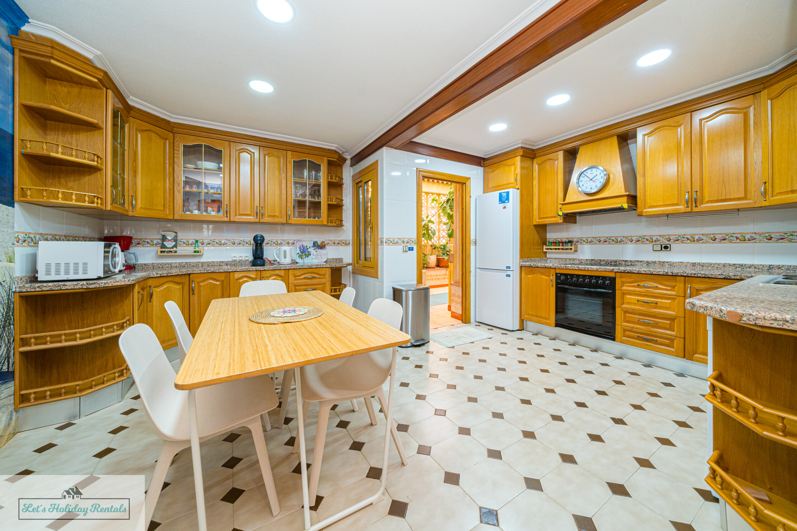 Un pasillo conduce a la amplia cocina, completamente equipada con electrodomésticos modernos, incluyendo frigorífico-congelador, fregadero doble, lavavajillas, vitrocerámica, horno eléctrico y campana extractora. También cuenta con todas las comodidades necesarias: cafetera, exprimidor, microondas y tostadora. Al lado de la cocina, encontrarás un patio abierto con una zona de lavandería, equipada con lavadora, fregadero doble y artículos de limpieza.