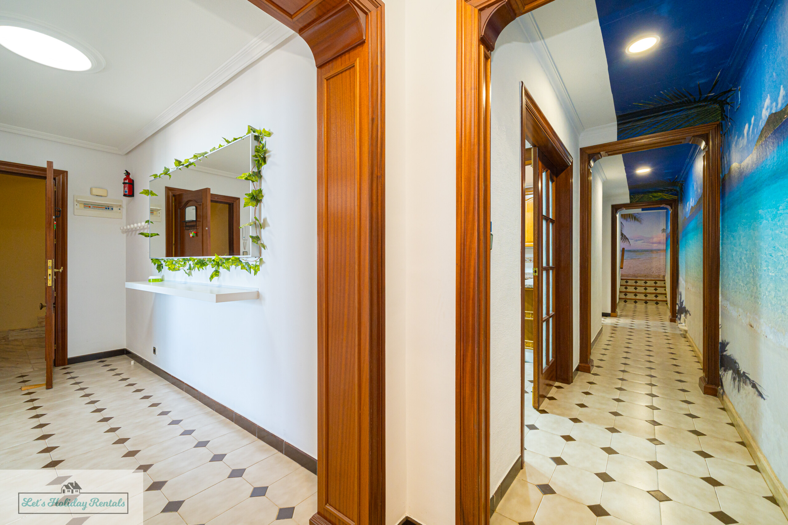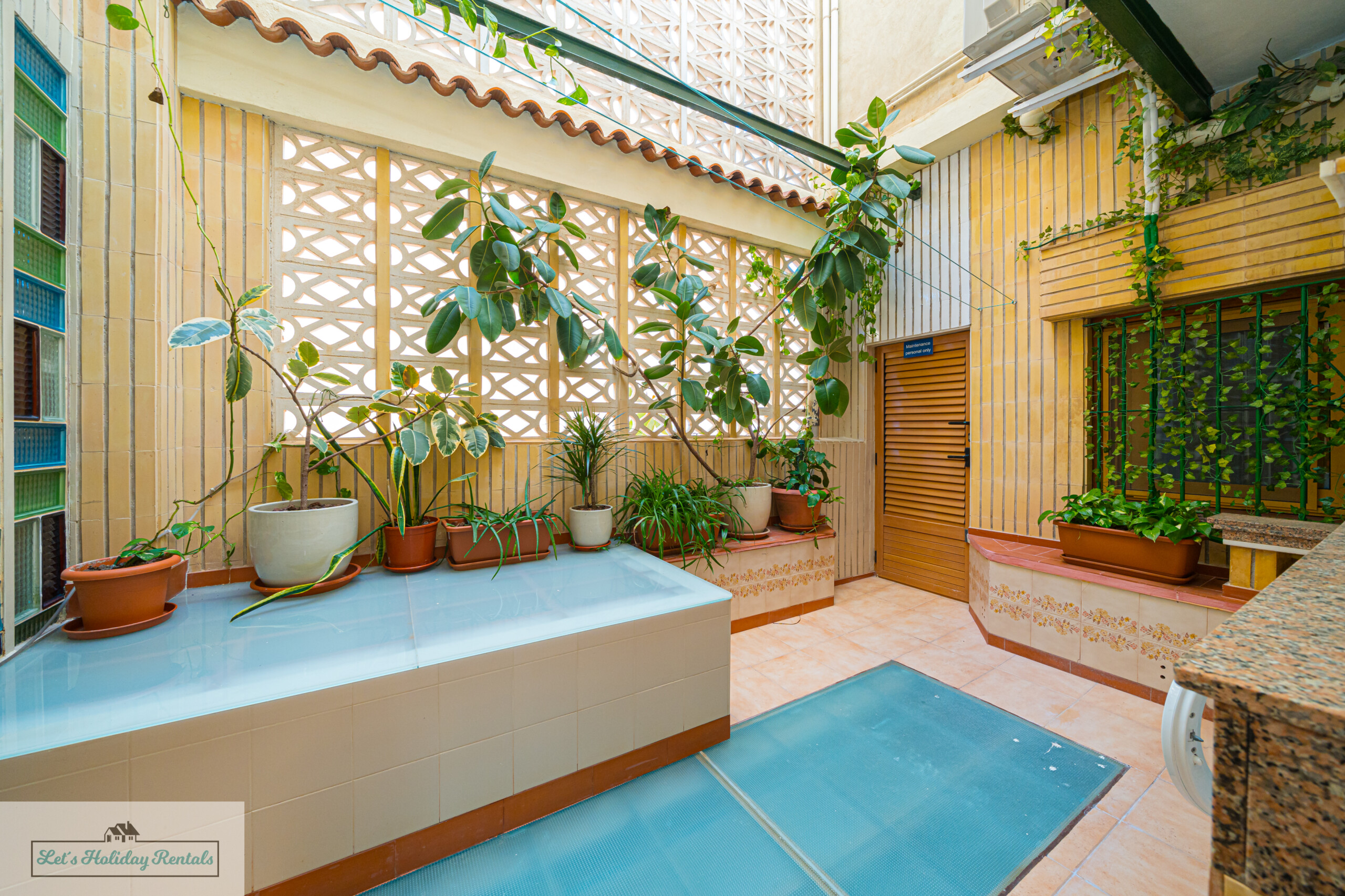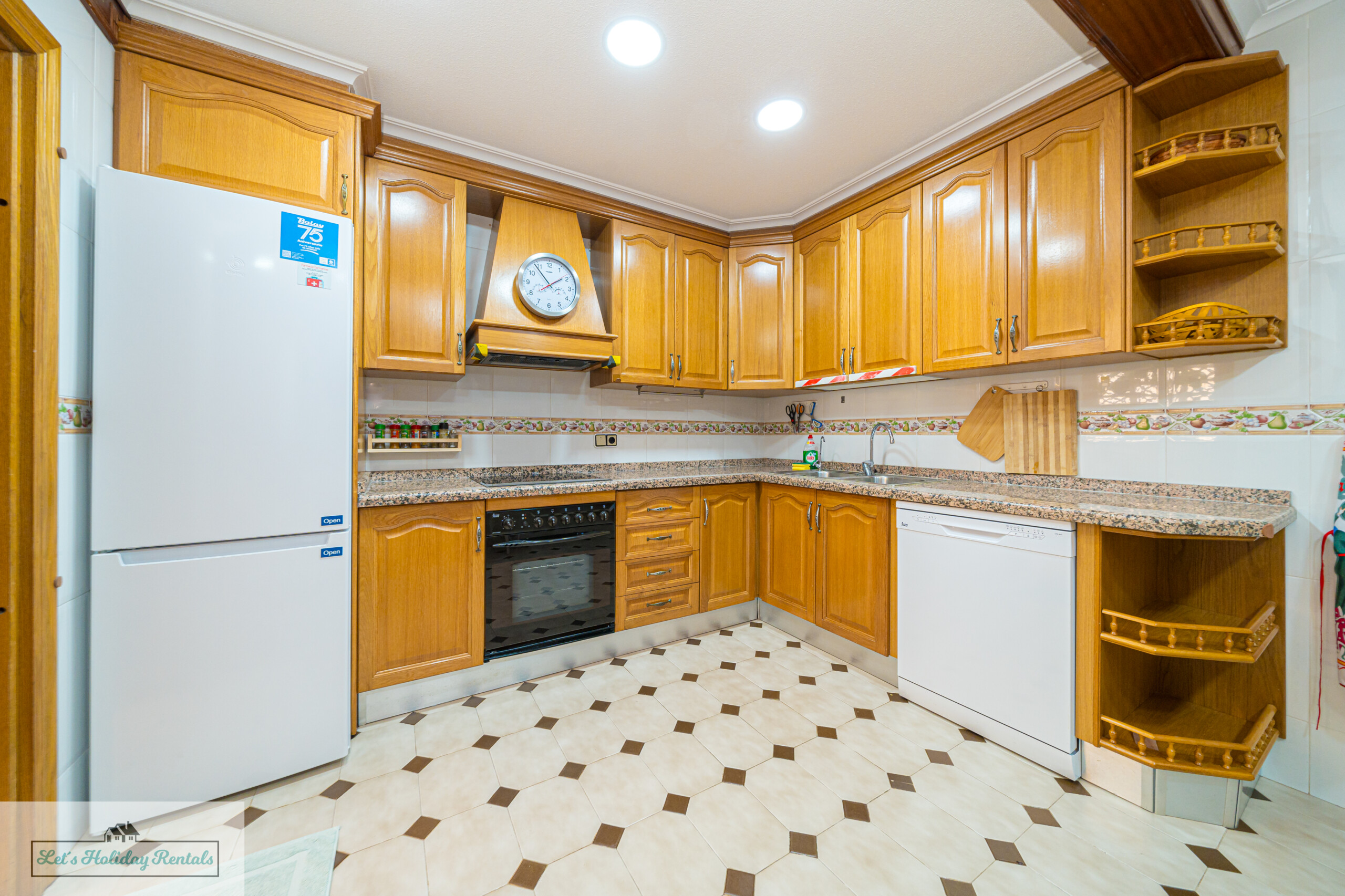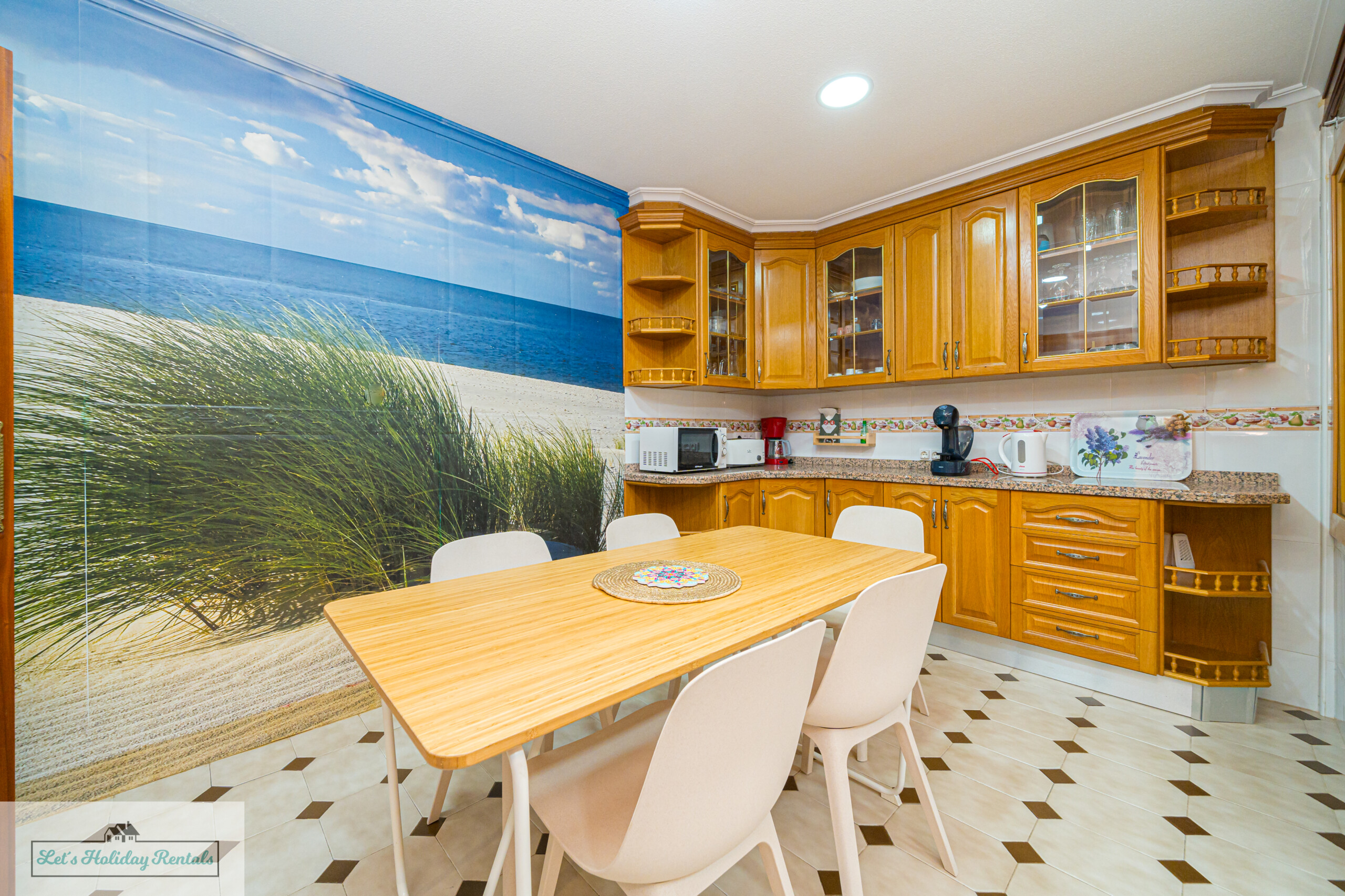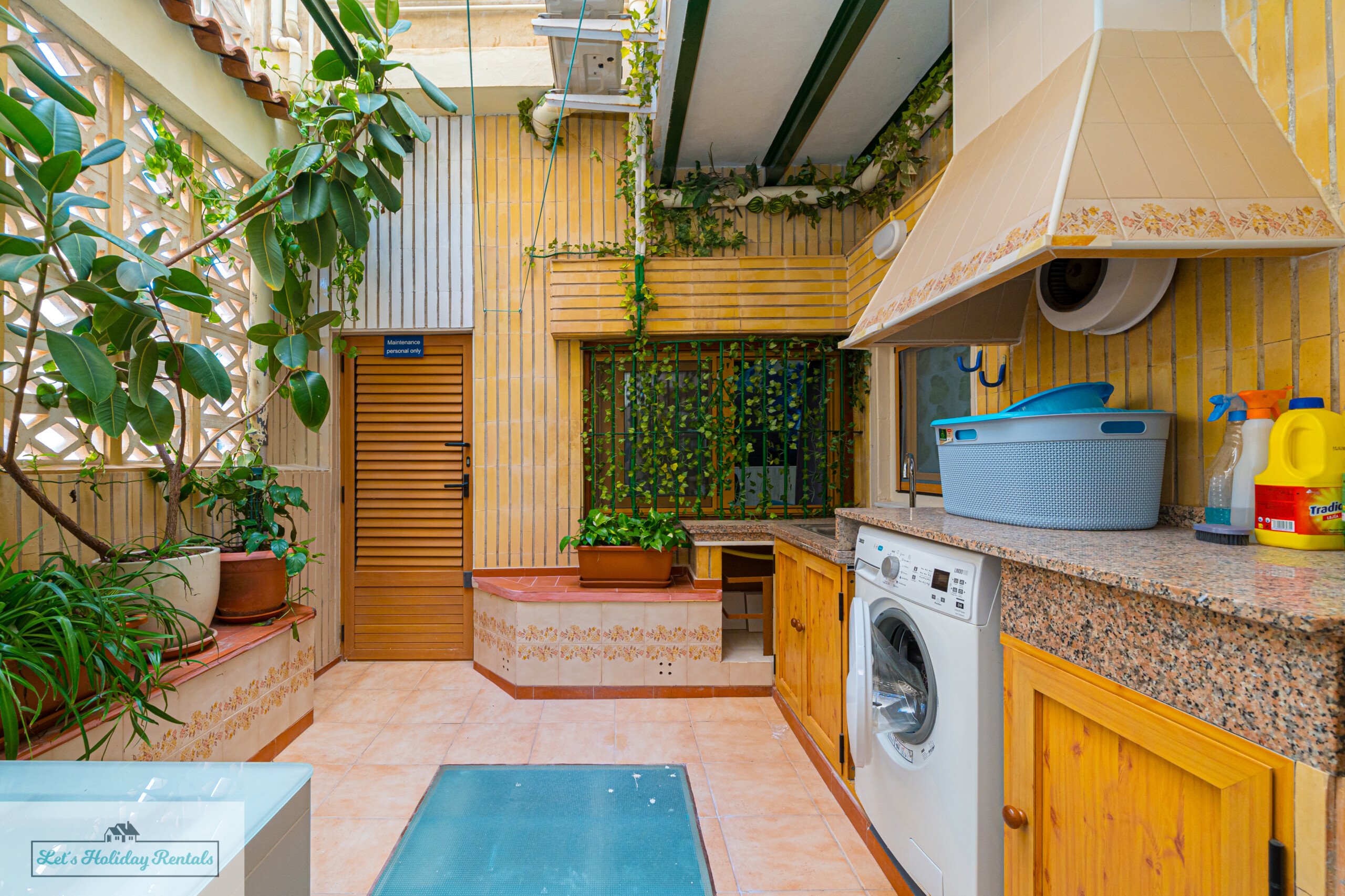 Un pasillo conduce a la amplia cocina, completamente equipada con electrodomésticos modernos, incluyendo frigorífico-congelador, fregadero doble, lavavajillas, vitrocerámica, horno eléctrico y campana extractora. También cuenta con todas las comodidades necesarias: cafetera, exprimidor, microondas y tostadora. Al lado de la cocina, encontrarás un patio abierto con una zona de lavandería, equipada con lavadora, fregadero doble y artículos de limpieza.