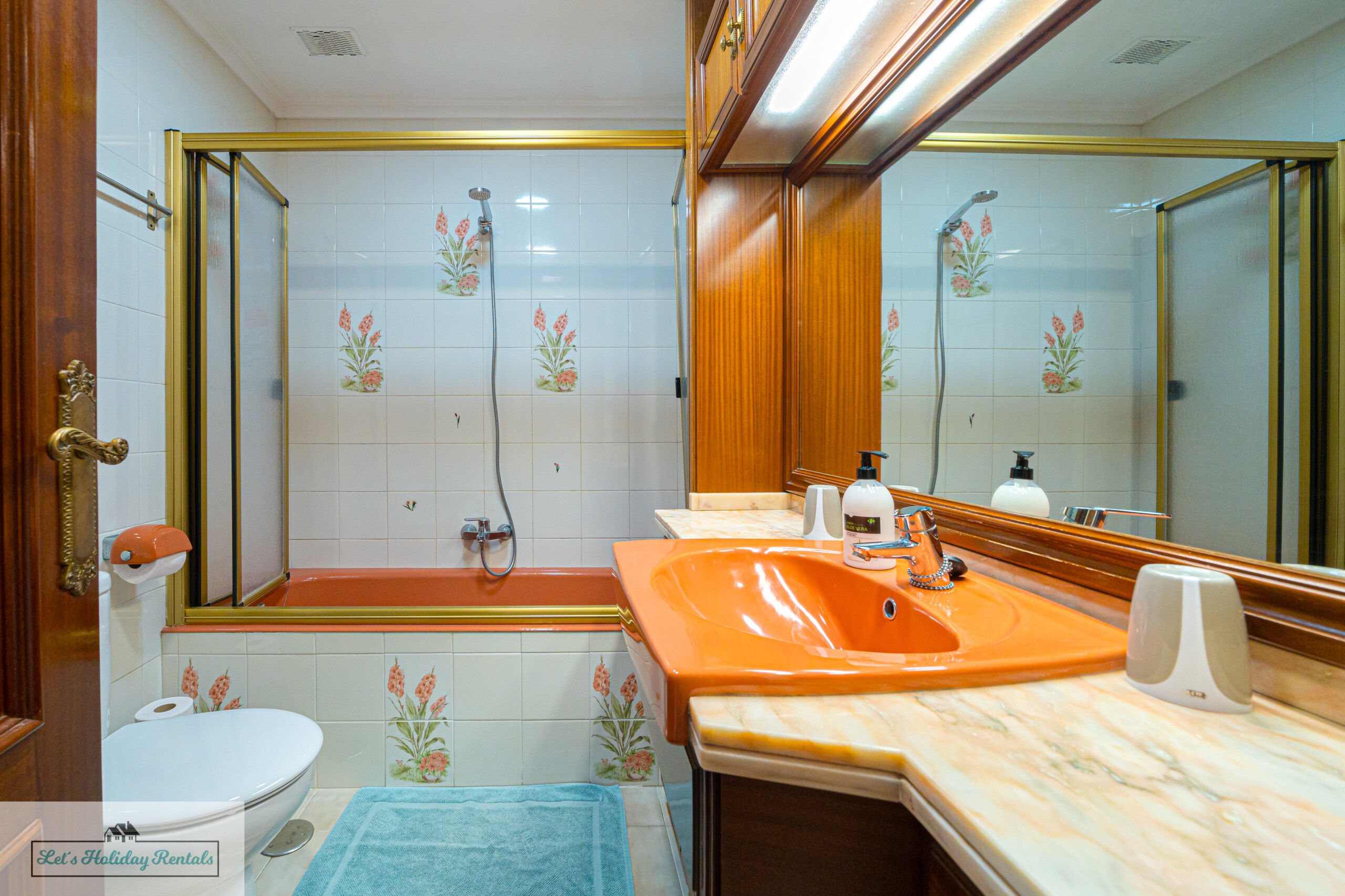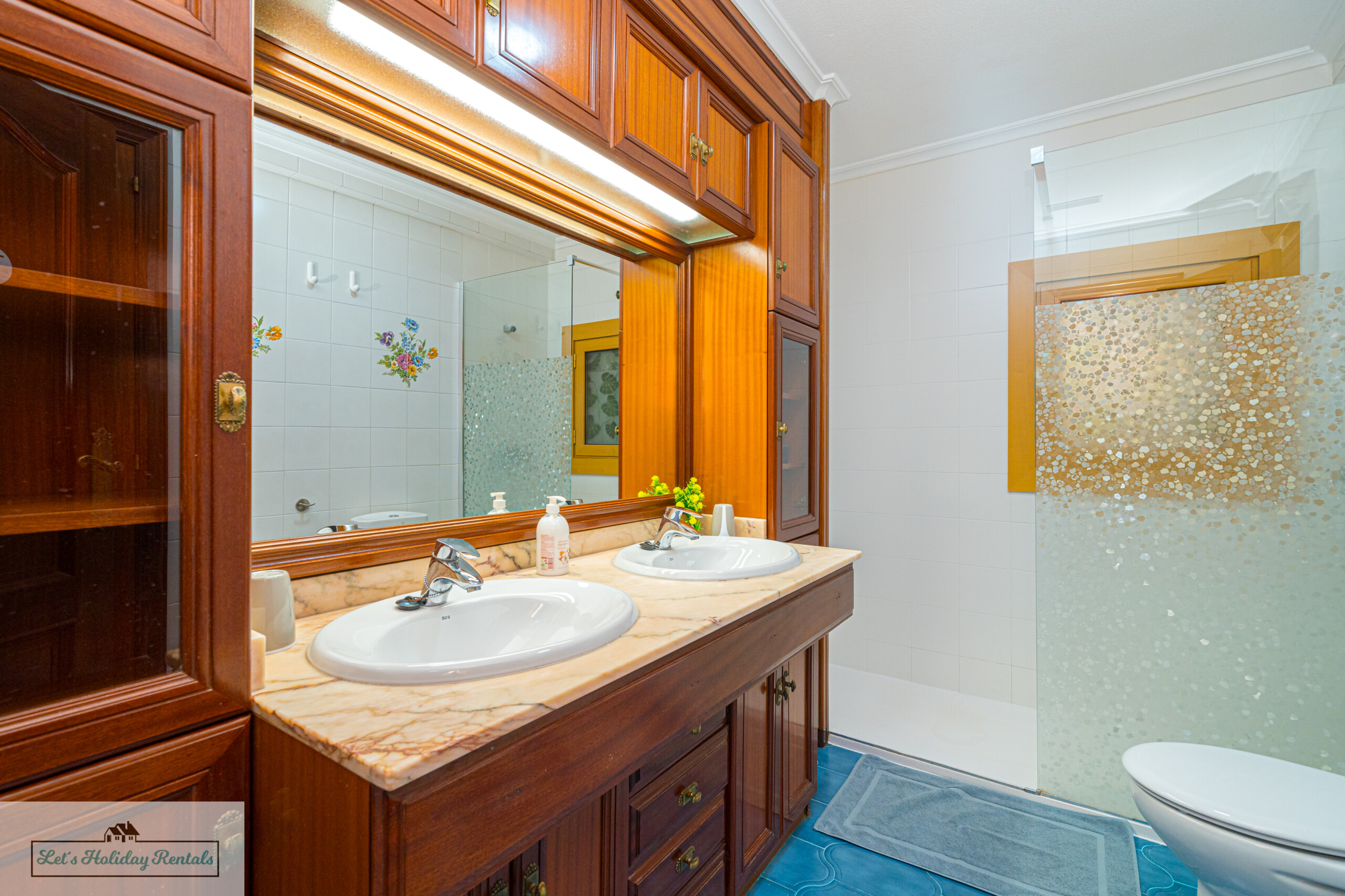 El baño familiar dispone de tocadores dobles con lavamanos para él y para ella, inodoro, bidé y una ducha moderna.