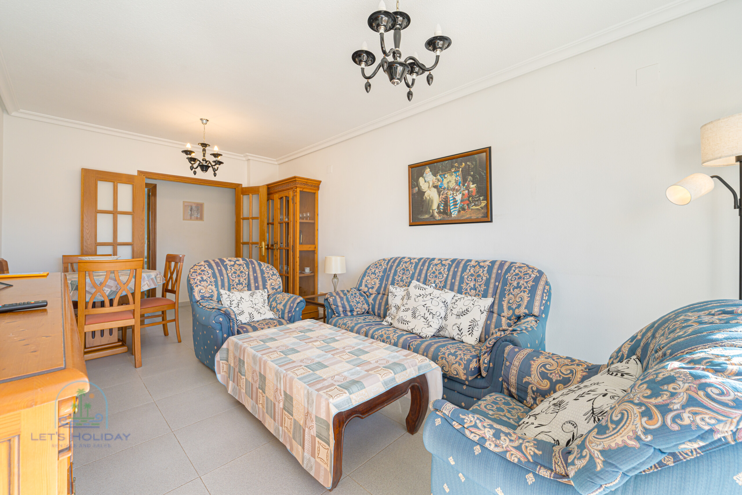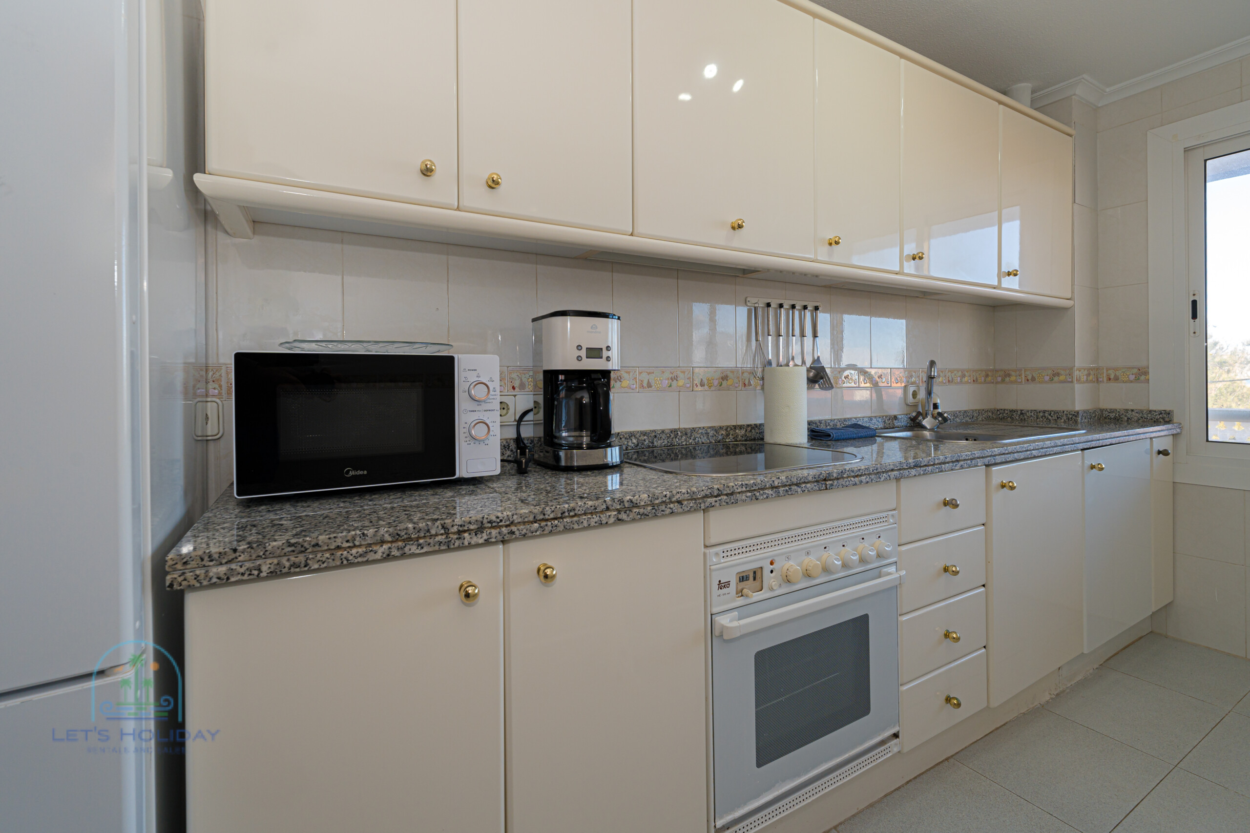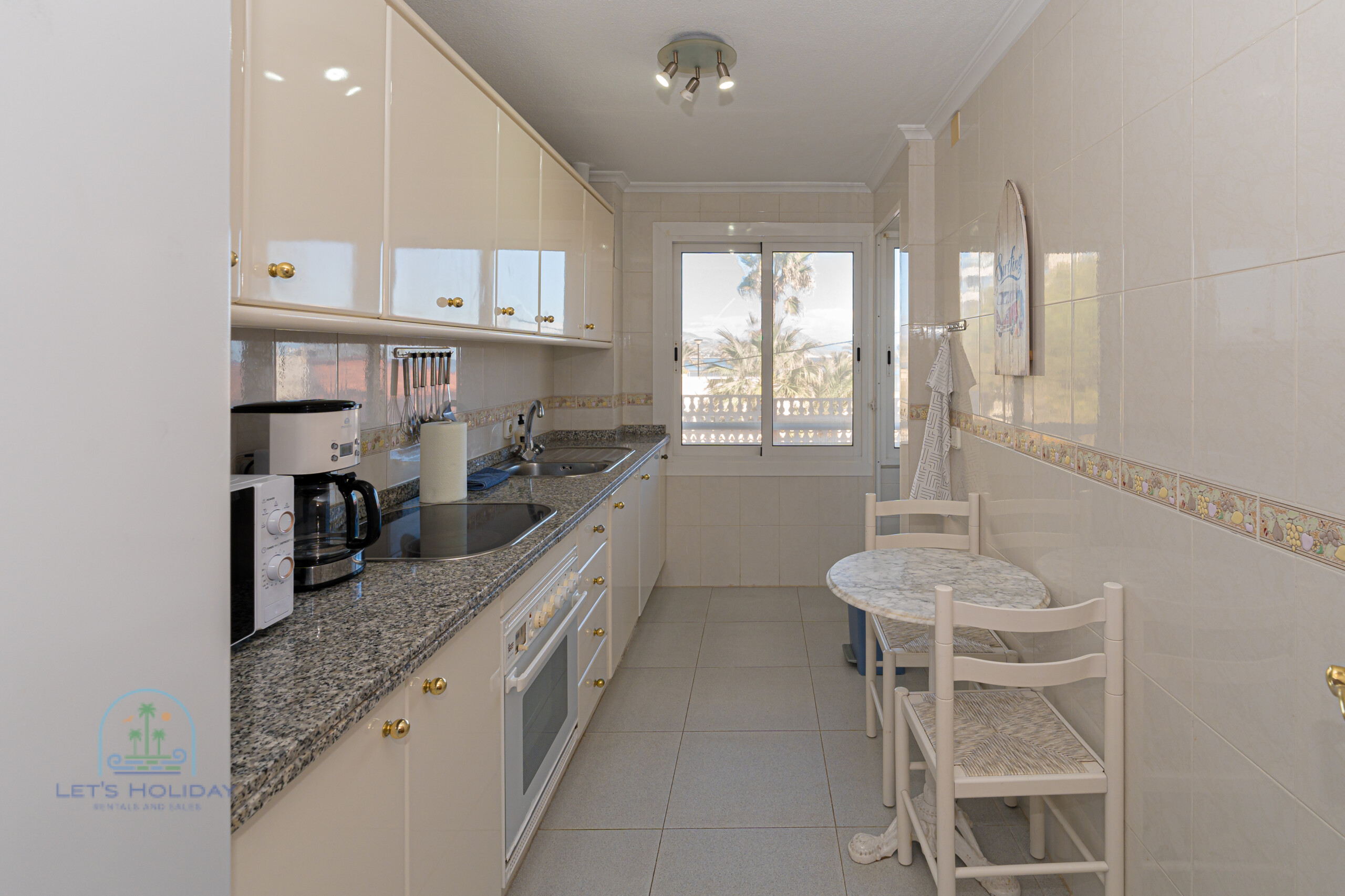 La sala de estar y el comedor son compactos pero luminosos, con muebles cómodos y una zona para comer. Además, cuentan con aire acondicionado para tu confort. Las puertas correderas conducen a un balcón con preciosas vistas al mar.