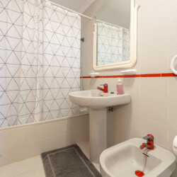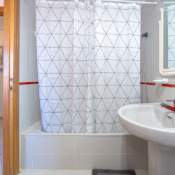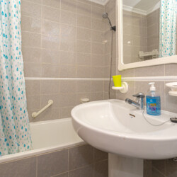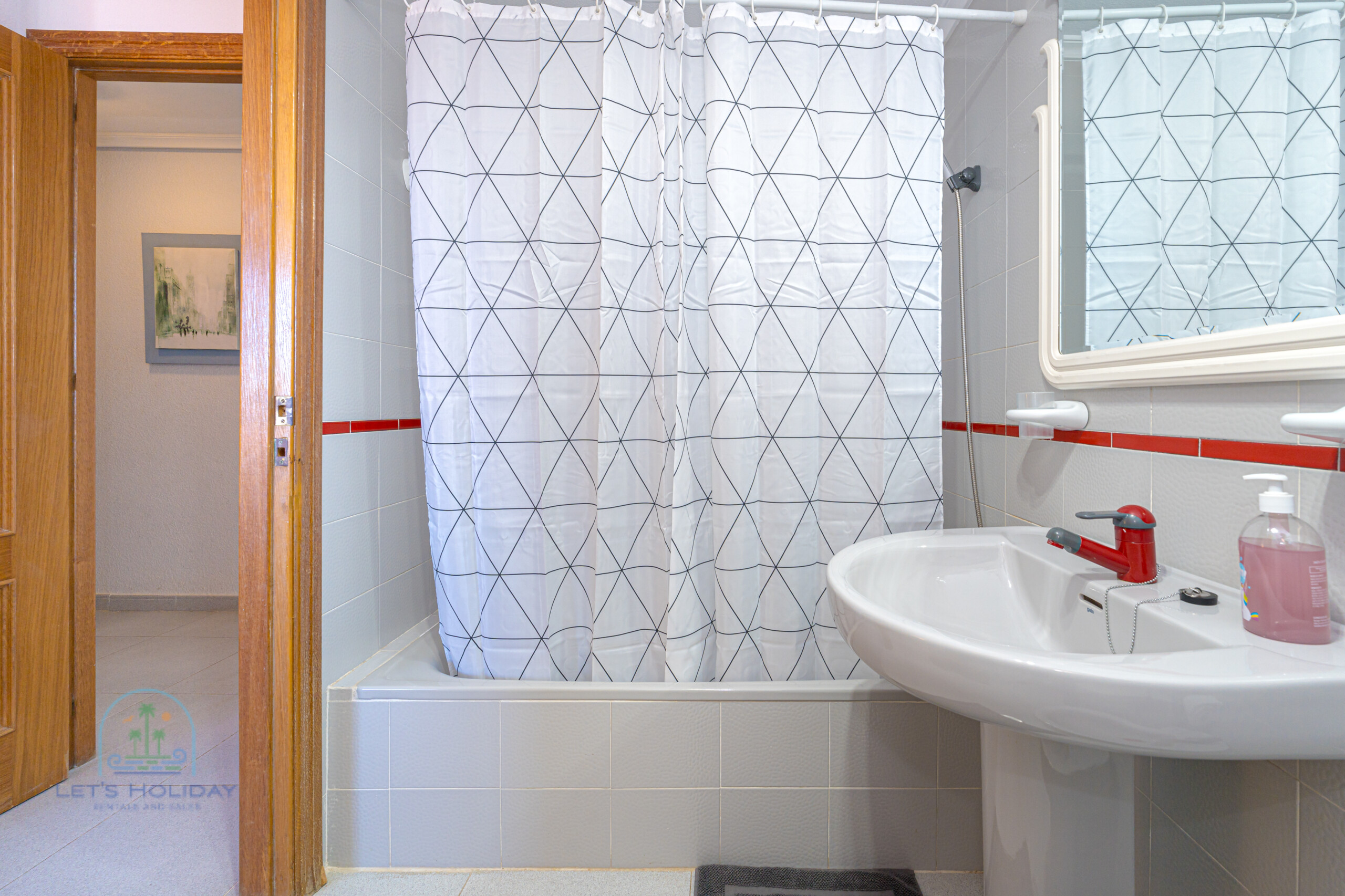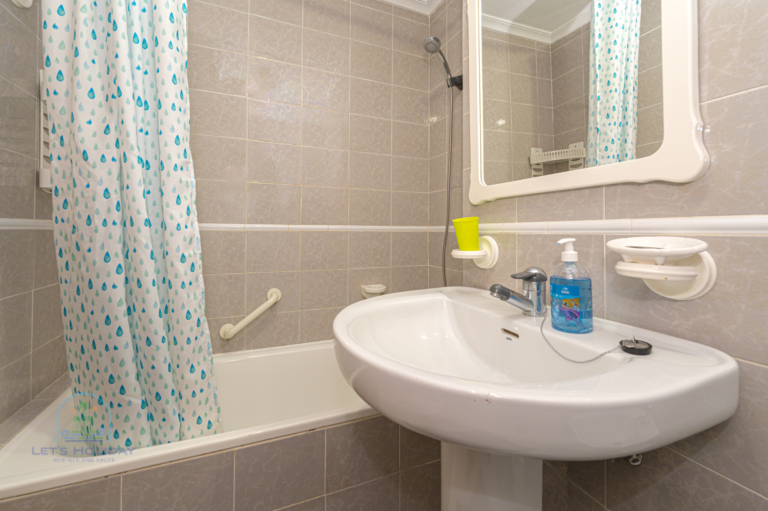 El baño familiar está equipado con una bañera de tamaño completo y una ducha superior.