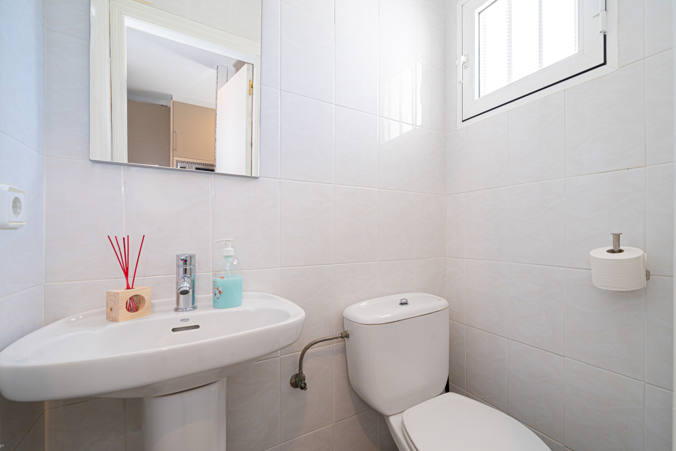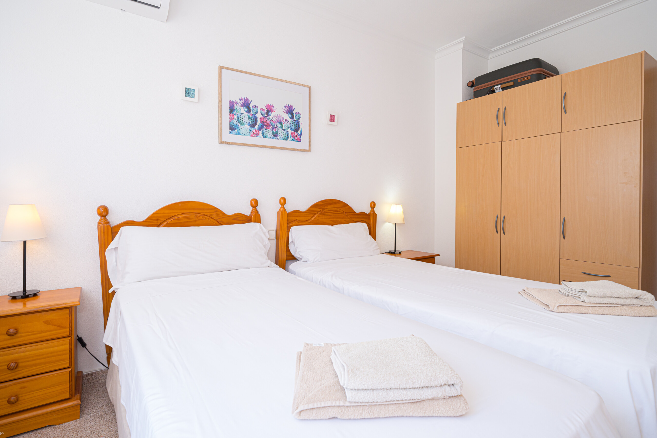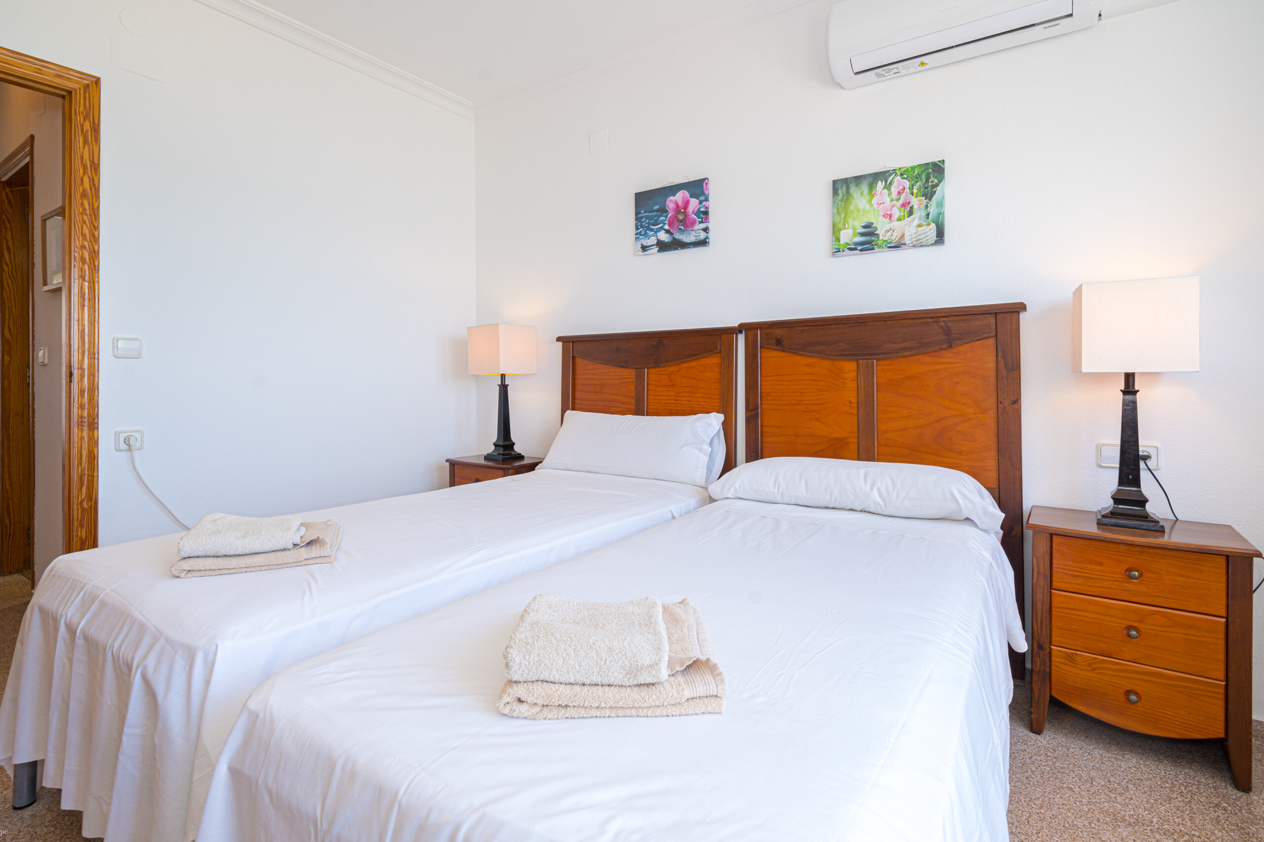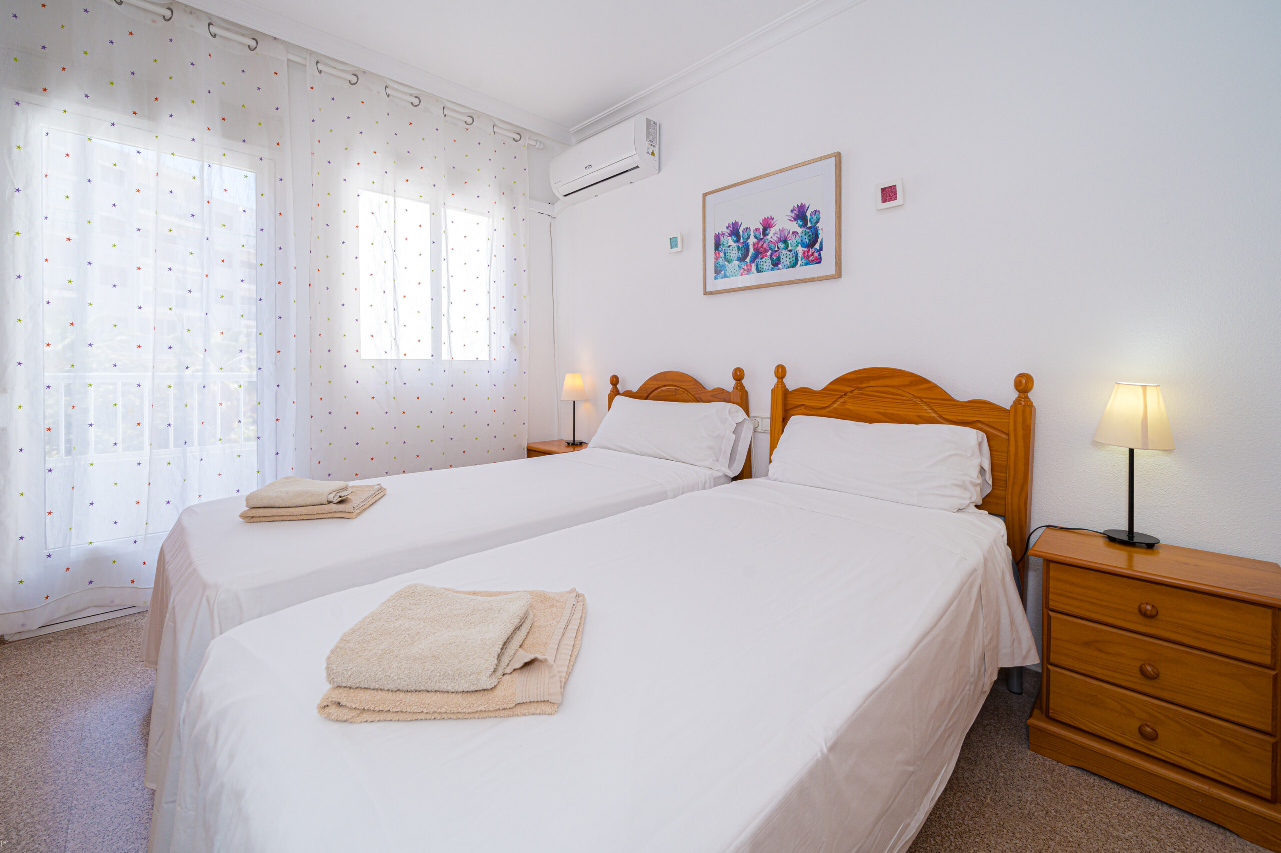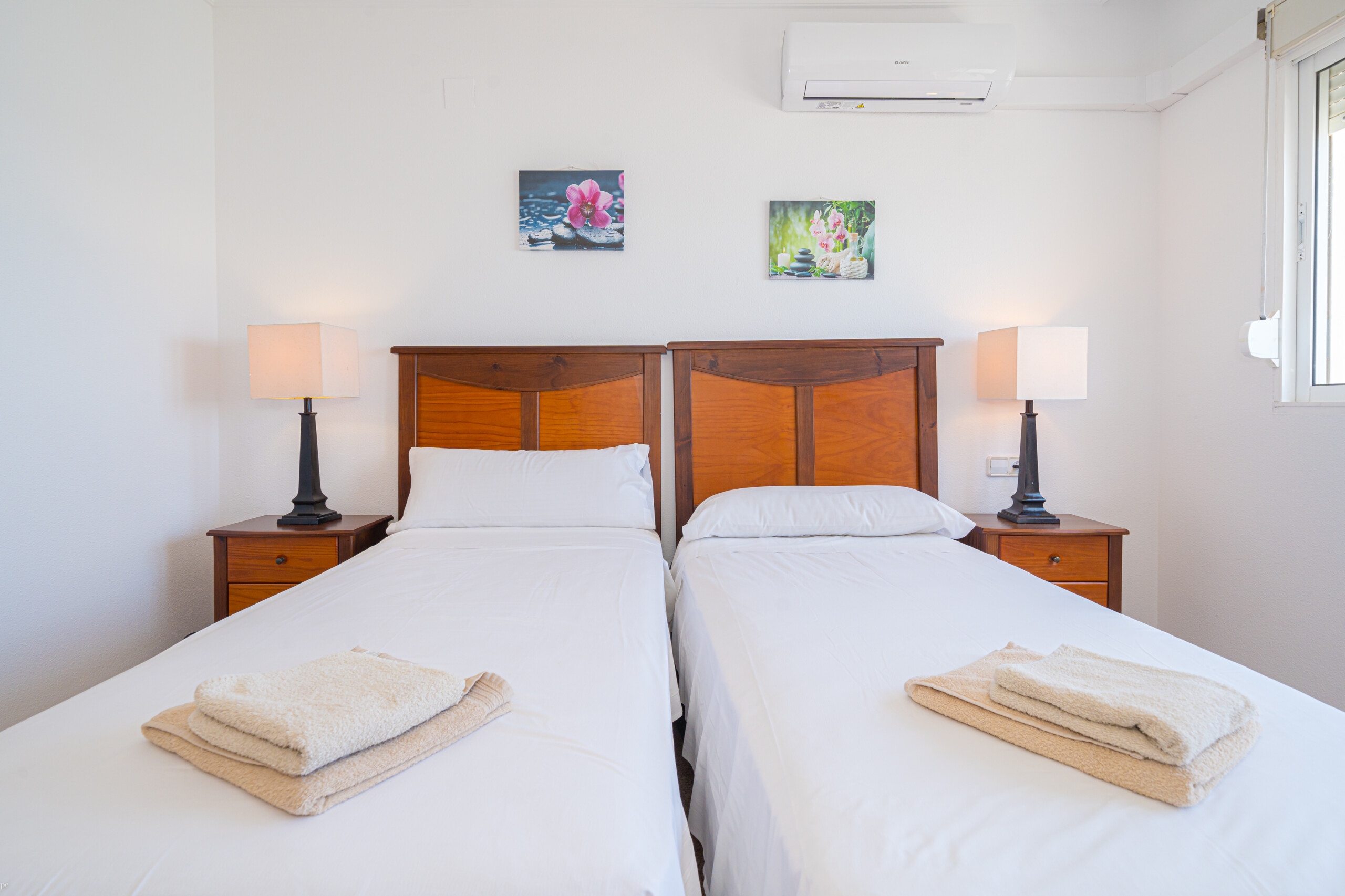 El apartamento consta de una cocina americana completamente equipada con todos los utensilios básicos para preparar una buena cena. El salón está amueblado con una mesa de comedor, sofá y sillas. Los dormitorios se encuentran en la segunda planta, cada uno de ellos con dos camas individuales. Las camas están hechas con ropa limpia y fresca, y se proporciona un juego de toallas (para la cara, la ducha y la piscina) para cada huésped. Además, hay un baño completo y un aseo situados en la planta baja.
