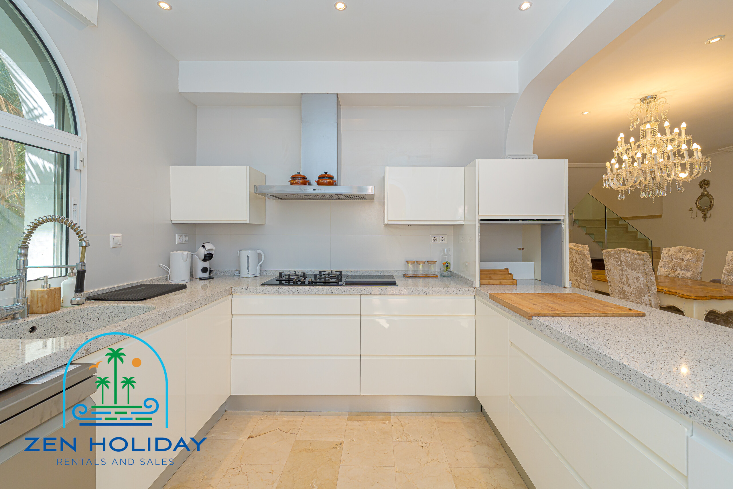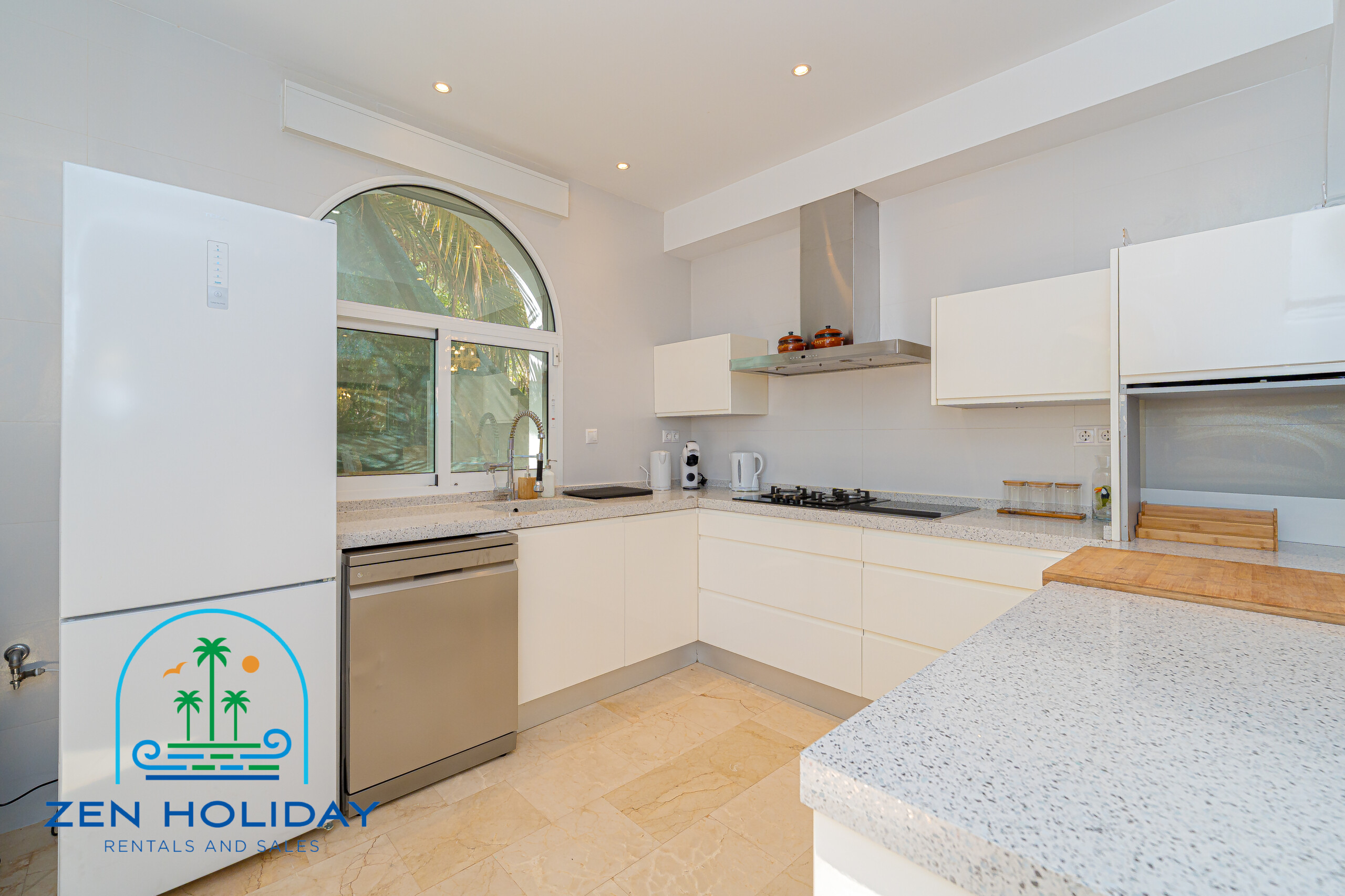 Fully equipped kitchen with oven, microwave, dishwasher, coffee maker, and washing machine