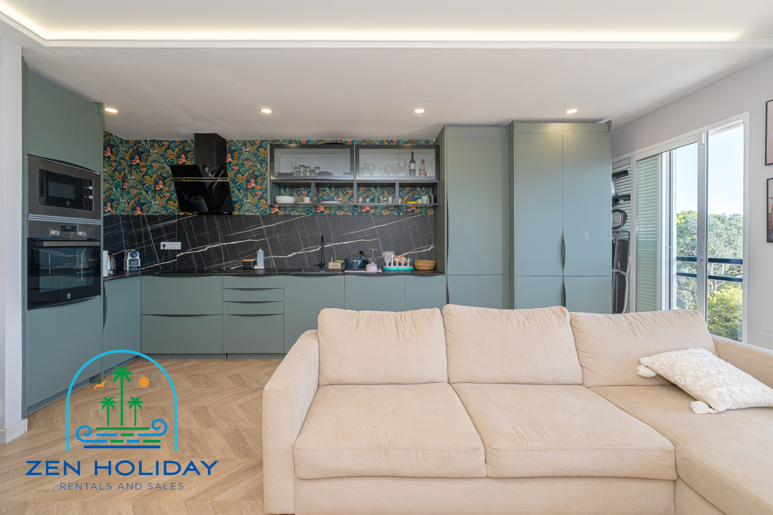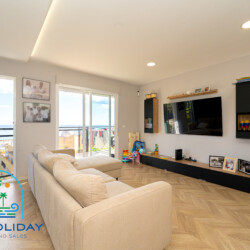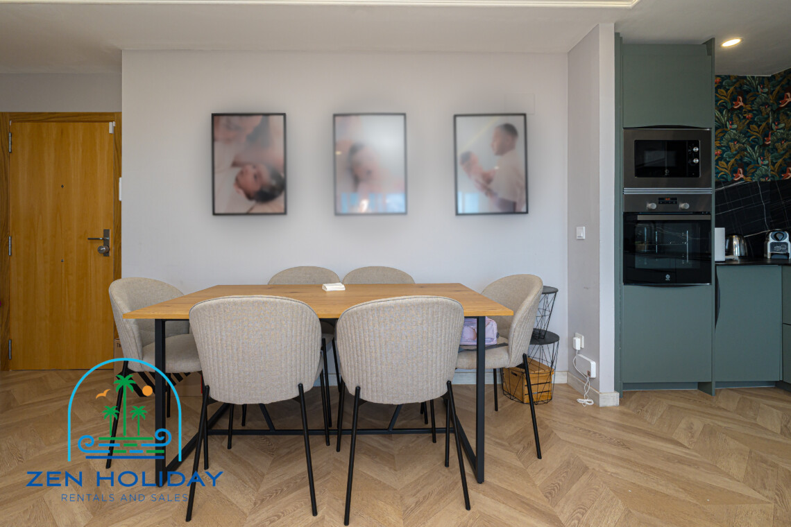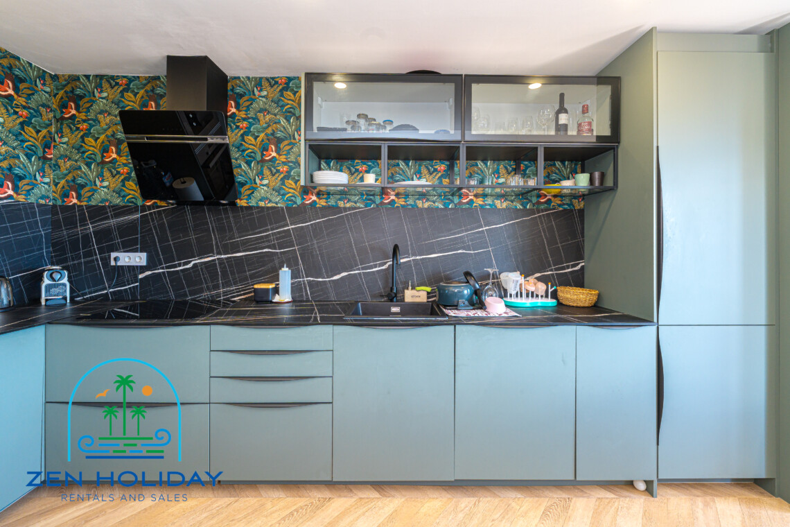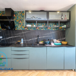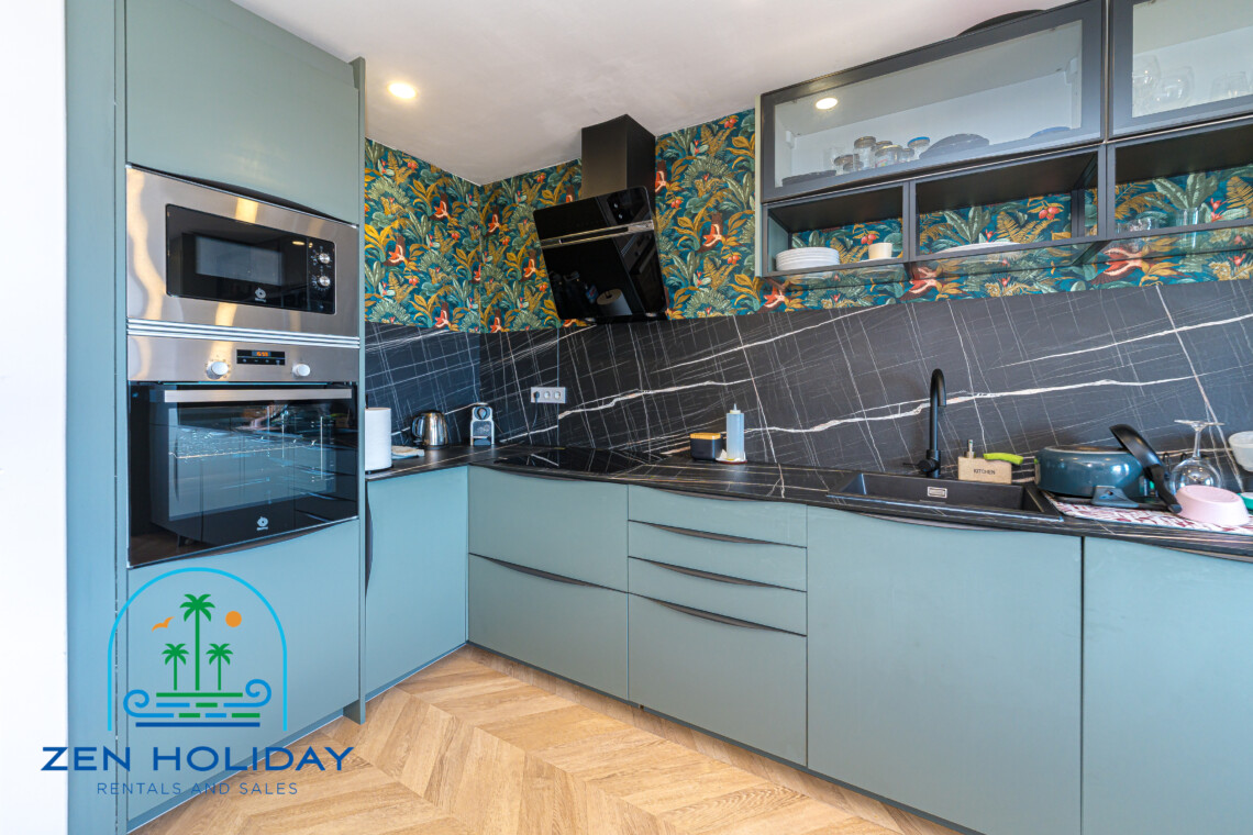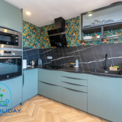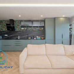 The apartment features an open-plan living room and a fully equipped modern kitchen — ideal for entertaining family and friends.